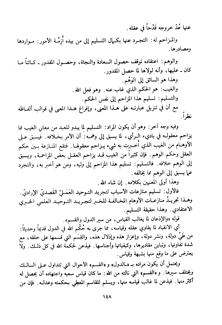 أَيِ الِانْقِيَادُ لِمَا يُقَاوِي عَقْلَهُ وَقِيَاسَهُ، مِمَّا جَرَى بِهِ حُكْمُ اللَّهِ فِي الدُّوَلِ قَدِيمًا وَحَدِيثًا: مِنْ طَيِّ دَوْلَةٍ، وَنَشْرِ دَوْلَةٍ، وَإِعْزَازِ هَذِهِ وَإِذْلَالِ هَذِهِ، وَالْقِسَمِ الَّتِي قَسَّمَهَا عَلَى خَلْقِهِ، مَعَ شِدَّةِ تَفَاوُتِهَا، وَتَبَايُنِ مَقَادِيرِهَا، وَكَيْفِيَّاتِهَا وَأَجْنَاسِهَا، فَيُذْعِنُ لِحِكْمَةِ اللَّهِ فِي كُلِّ ذَلِكَ، وَلَا يَعْتَرِضُ عَلَى مَا وَقَعَ مِنْهَا بِشُبْهَةٍ وَقِيَاسٍ.