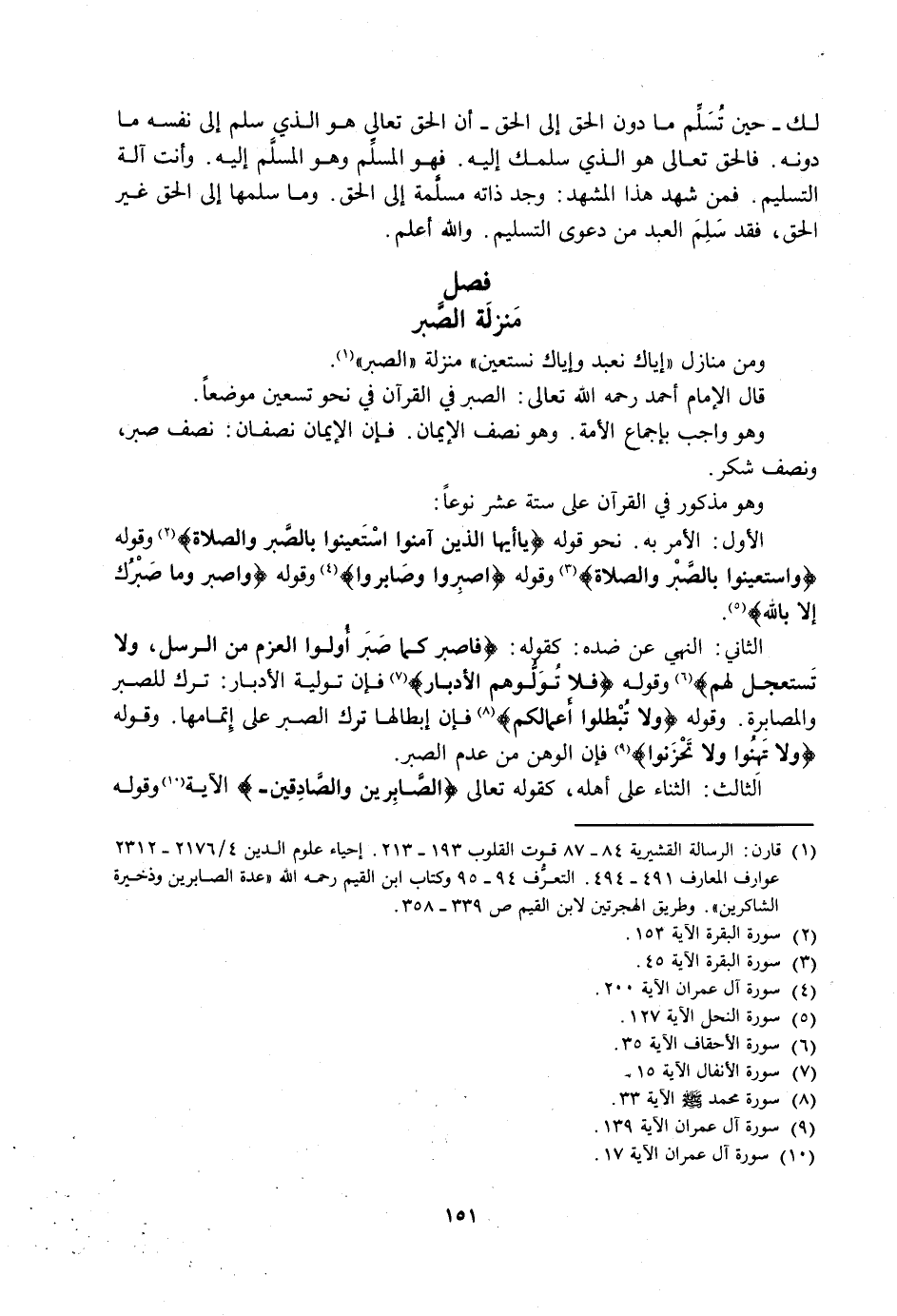 وَمِنْ مَنَازِلِ: {إِيَّاكَ نَعْبُدُ وَإِيَّاكَ نَسْتَعِينُ} [الفاتحة: 5] مَنْزِلَةُ الصَّبْرِ.