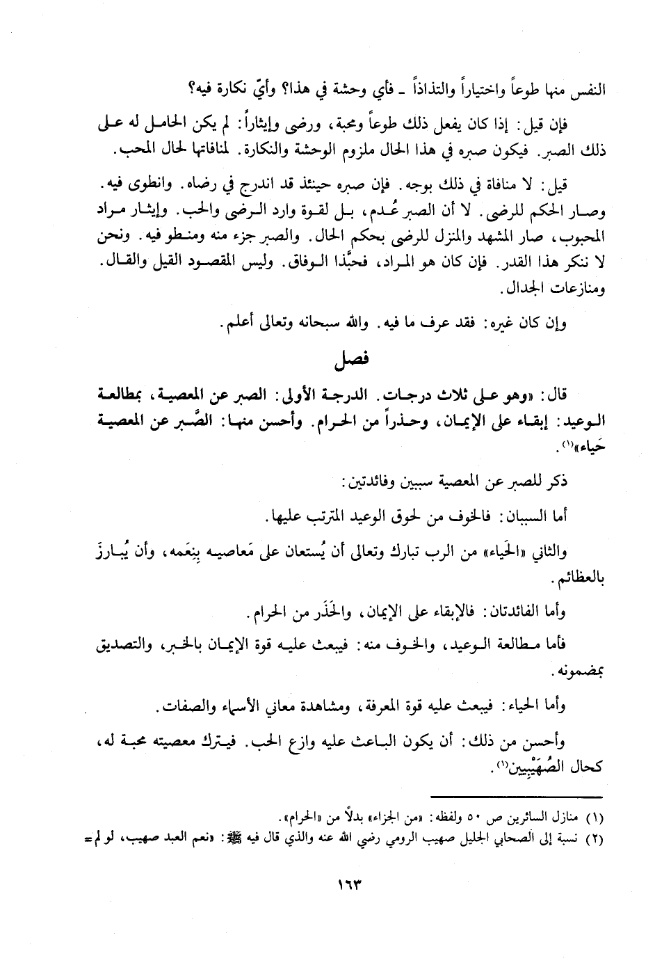 قَالَ: وَهُوَ عَلَى ثَلَاثِ دَرَجَاتٍ: الدَّرَجَةُ الْأُولَى: الصَّبْرُ عَنِ الْمَعْصِيَةِ، بِمُطَالَعَةِ الْوَعِيدِ: إِبْقَاءً عَلَى الْإِيمَانِ، وَحَذَرًا مِنَ الْحَرَامِ، وَأَحْسَنُ مِنْهَا: الصَّبْرُ عَنِ الْمَعْصِيَةِ حَيَاءً.