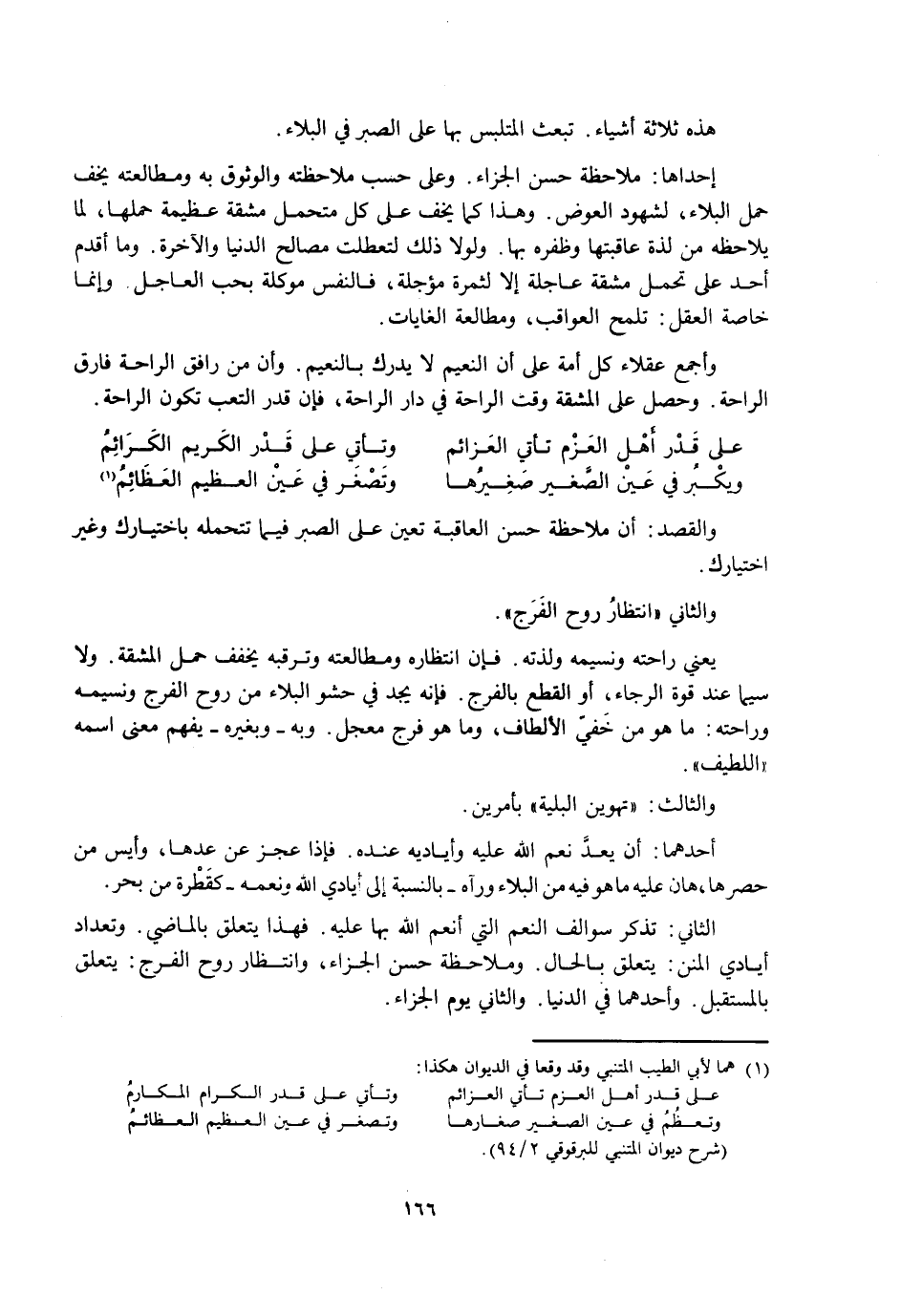 هَذِهِ ثَلَاثَةُ أَشْيَاءَ تَبْعَثُ الْمُتَلَبِّسَ بِهَا عَلَى الصَّبْرِ فِي الْبَلَاءِ.