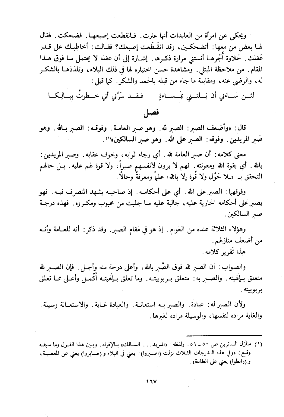 قَالَ وَأَضْعَفُ الصَّبْرِ: الصَّبْرُ لِلَّهِ. وَهُوَ صَبْرُ الْعَامَّةِ. وَفَوْقَهُ: الصَّبْرُ بِاللَّهِ. وَهُوَ صَبْرُ الْمُرِيدِينَ. وَفَوْقَهُ: الصَّبْرُ عَلَى اللَّهِ. وَهُوَ صَبْرُ السَّالِكِينَ.