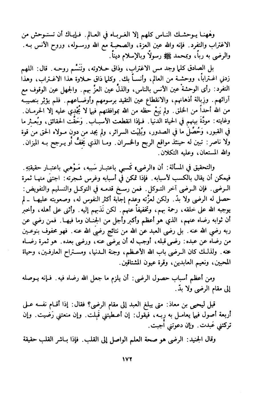 وَهَاهُنَا يُوحِشُكَ النَّاسُ كُلُّهُمْ إِلَّا الْغُرَبَاءَ فِي الْعَالَمِ. فَإِيَّاكَ أَنْ تَسْتَوْحِشَ مِنْ الِاغْتِرَابِ وَالتَّفَرُّدِ. فَإِنَّهُ وَاللَّهِ عَيْنُ الْعِزَّةِ، وَالصُّحْبَةِ مَعَ اللَّهِ وَرَسُولِهِ، وَرُوحُ الْأُنْسِ بِهِ. وَالرِّضَا بِهِ رَبًّا، وَبِمُحَمَّدٍ صَلَّى اللَّهُ عَلَيْهِ وَسَلَّمَ رَسُولًا وَبِالْإِسْلَامِ دِينًا.