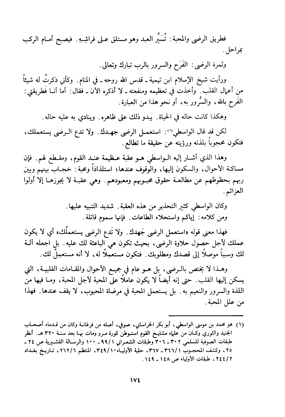 وَهَكَذَا كَانَتْ حَالُهُ فِي الْحَيَاةِ. يَبْدُو ذَلِكَ عَلَى ظَاهِرِهِ. وَيُنَادِي بِهِ عَلَيْهِ حَالُهُ. لَكِنْ قَدْ قَالَ الْوَاسِطِيٌّ: اسْتَعْمِلِ الرِّضَا جُهْدَكَ. وَلَا تَدَعِ الرِّضَا يَسْتَعْمِلُكِ، فَتَكُونَ مَحْجُوبًا بِلَذَّتِهِ وَرُؤْيَتِهِ عَنْ حَقِيقَةِ مَا تُطَالِعُ.