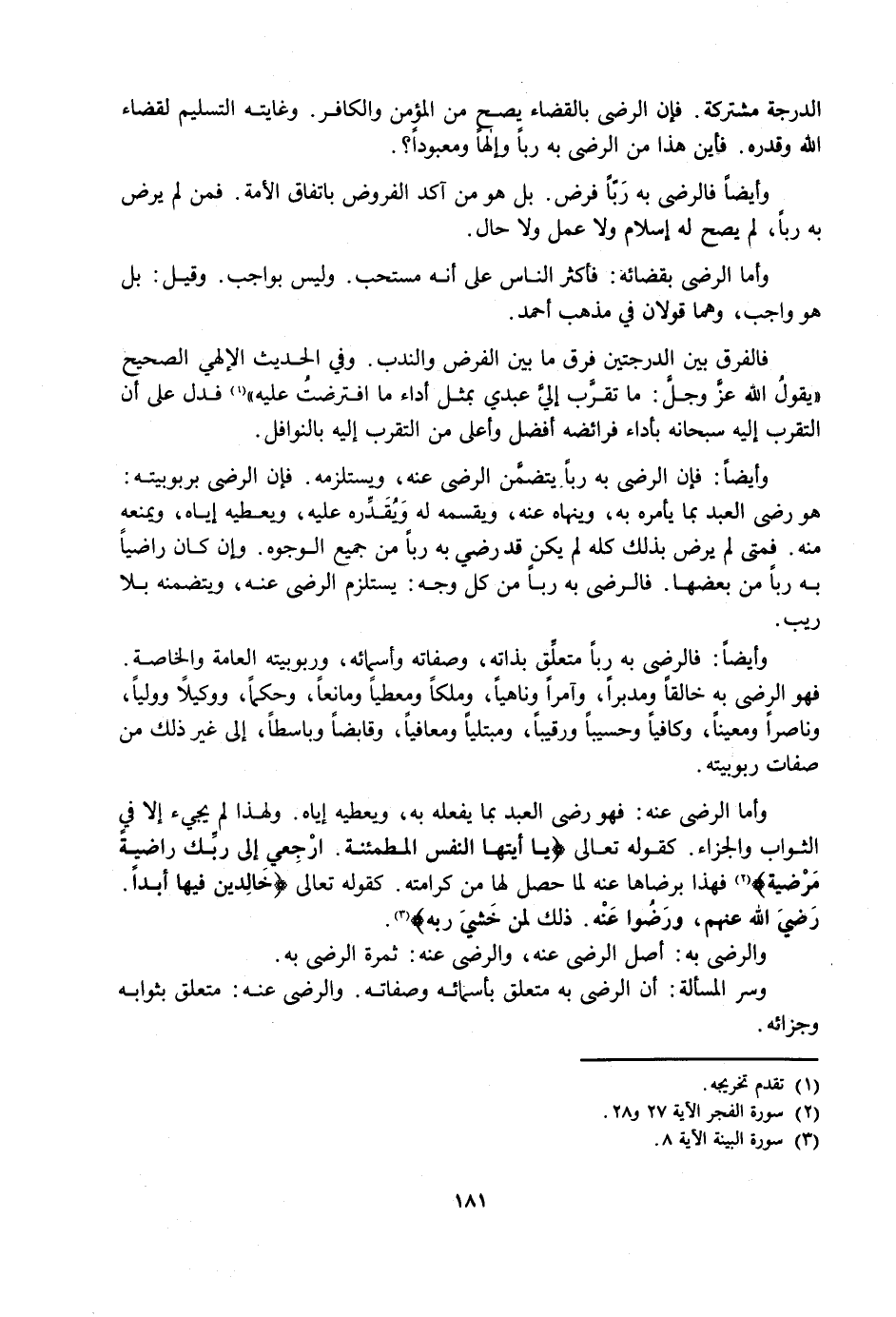 وَأَيْضًا: فَإِنَّ الرِّضَا بِهِ رَبًّا يَتَضَمَّنُ الرِّضَا عَنْهُ، وَيَسْتَلْزِمُهُ. فَإِنَّ الرِّضَا بِرُبُوبِيَّتِهِ: هُوَ رِضَا الْعَبْدِ بِمَا يَأْمُرُهُ بِهِ، وَيَنْهَاهُ عَنْهُ، وَيَقْسِمُهُ لَهُ وَيُقَدِّرُهُ عَلَيْهِ، وَيُعْطِيهِ إِيَّاهُ، وَيَمْنَعُهُ مِنْهُ. فَمَتَى لَمْ يَرْضَ بِذَلِكَ كُلِّهِ لَمْ يَكُنْ قَدْ رَضِيَ بِهِ رَبًّا مِنْ جَمِيعِ الْوُجُوهِ. وَإِنْ كَانَ رَاضِيًا بِهِ رَبًّا مِنْ بَعْضِهَا. فَالرِّضَا بِهِ رَبًّا مِنْ كُلِّ وَجْهٍ: يَسْتَلْزِمُ الرِّضَا عَنْهُ، وَيَتَضَمَّنُهُ بِلَا رَيْبٍ.