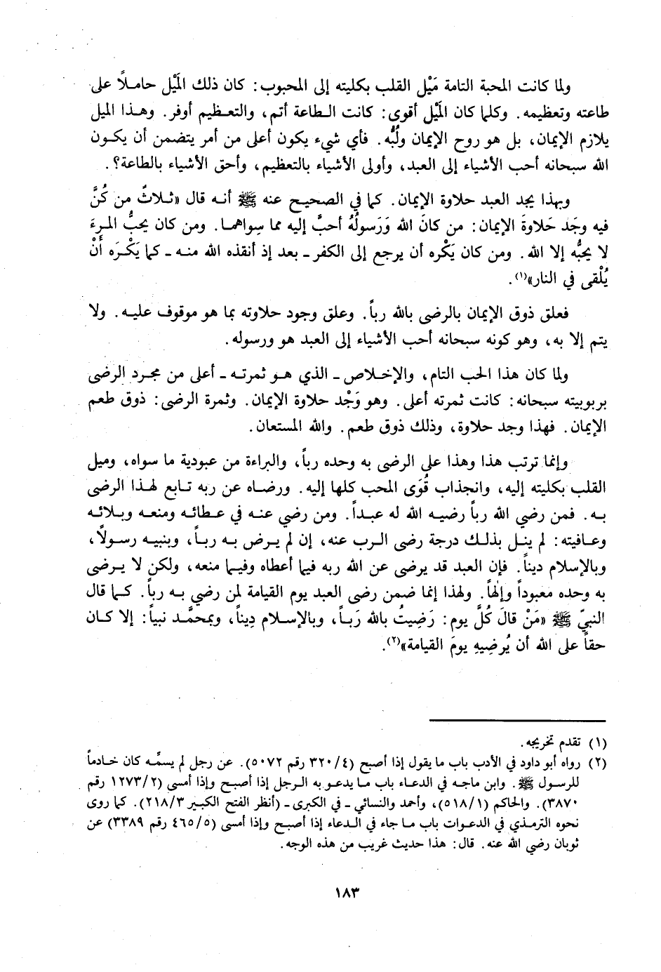 فَعَلَّقَ ذَوْقَ الْإِيمَانِ بِالرِّضَا بِاللَّهِ رَبًا. وَعَلَّقَ وُجُودَ حَلَاوَتِهِ بِمَا هُوَ مَوْقُوفٌ عَلَيْهِ. وَلَا يَتِمُّ إِلَّا بِهِ، وَهُوَ كَوْنُهُ سُبْحَانَهُ أَحَبَّ الْأَشْيَاءِ إِلَى الْعَبْدِ هُوَ وَرَسُولُهُ.