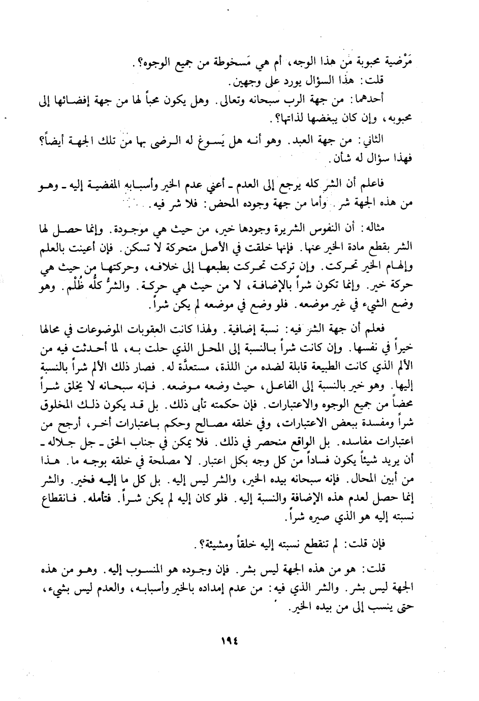 قُلْتُ: هُوَ مِنْ هَذِهِ الْجِهَةِ لَيْسَ بِشَرٍّ. فَإِنَّ وُجُودَهُ هُوَ الْمَنْسُوبُ إِلَيْهِ. وَهُوَ مِنْ هَذِهِ الْجِهَةِ لَيْسَ بِشَرٍّ. وَالشَّرُّ الَّذِي فِيهِ: مِنْ عَدَمِ إِمْدَادِهِ بِالْخَيْرِ وَأَسْبَابِهِ، وَالْعَدَمُ لَيْسَ بِشَيْءٍ، حَتَّى يُنْسَبَ إِلَى مَنْ بِيَدِهِ الْخَيْرُ.