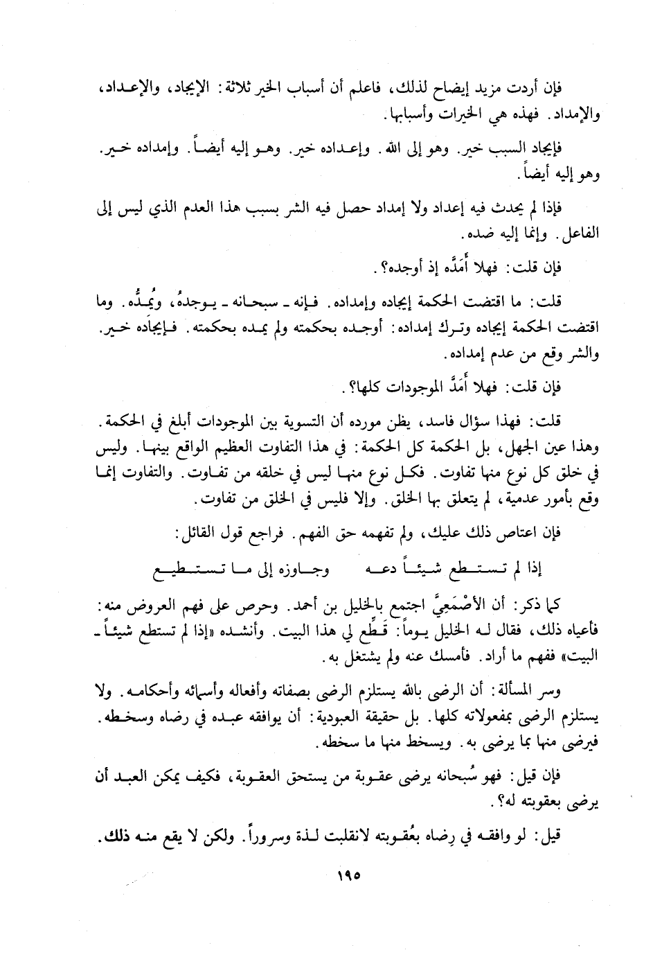 قُلْتُ: مَا اقْتَضَتِ الْحِكْمَةُ إِيجَادَهُ وَإِمْدَادَهُ. فَإِنَّهُ - سُبْحَانَهُ - يُوجِدُ وَيُمِدُّهُ، وَمَا اقْتَضَتِ الْحِكْمَةُ إِيجَادَهُ وَتَرْكَ إِمْدَادِهِ: أَوْجَدَهُ بِحِكْمَتِهِ وَلَمْ يُمِدَّهُ بِحِكْمَتِهِ. فَإِيجَادُهُ خَيْرٌ. وَالشَّرُّ وَقَعَ مِنْ عَدَمِ إِمْدَادِهِ.