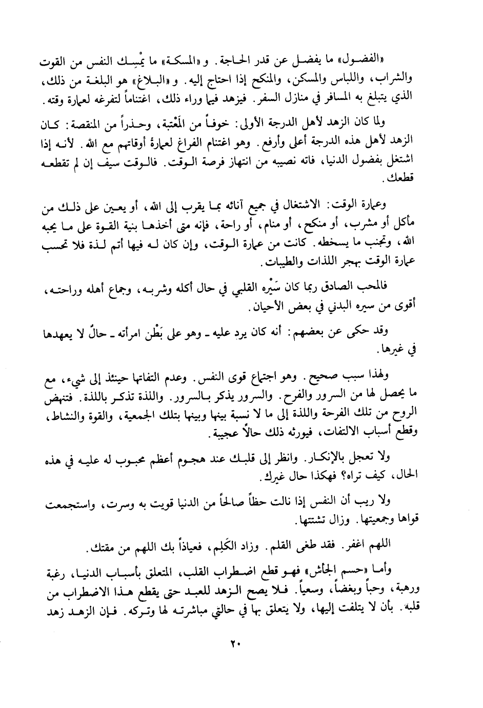 الْفُضُولُ مَا يَفْضُلُ عَنْ قَدَرِ الْحَاجَةِ. وَالْمُسْكَةُ مَا يَمْسِكُ النَّفْسَ مِنَ الْقُوتِ وَالشَّرَابِ، وَاللِّبَاسِ وَالْمَسْكَنِ، وَالْمَنْكَحِ إِذَا احْتَاجَ إِلَيْهِ. وَالْبَلَاغُ هُوَ الْبُلْغَةُ مِنْ ذَلِكَ، الَّذِي يَتَبَلَّغُ بِهِ الْمُسَافِرُ فِي مَنَازِلَ السَّفَرِ. فَيَزْهَدُ فِيمَا وَرَاءَ ذَلِكَ، اغْتِنَامًا لِتَفَرُّغِهِ لِعِمَارَةِ وَقْتِهِ.