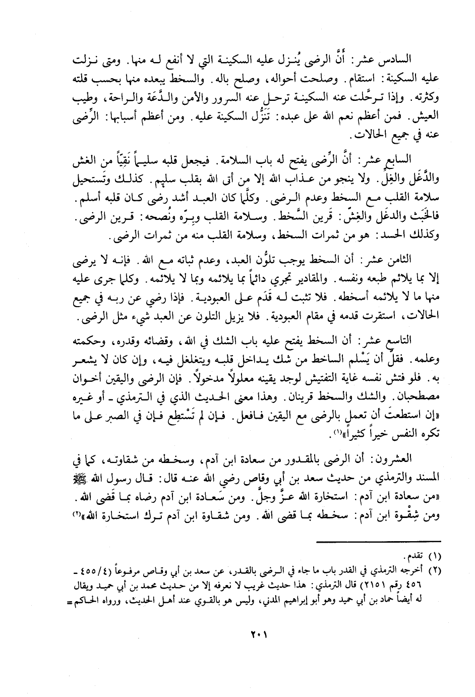 الْعِشْرُونَ: أَنَّ الرِّضَا بِالْمَقْدُورِ مِنْ سَعَادَةِ ابْنِ آدَمَ، وَسُخْطَهُ مِنْ شَقَاوَتِهِ، كَمَا فِي الْمُسْنَدِ وَالتِّرْمِذِيِّ مِنْ حَدِيثِ سَعْدِ بْنِ أَبِي وَقَّاصٍ رَضِيَ اللَّهُ عَنْهُ قَالَ: قَالَ رَسُولُ اللَّهِ صَلَّى اللَّهُ عَلَيْهِ وَسَلَّمَ «مِنْ سَعَادَةِ ابْنِ آدَمَ: اسْتِخَارَةُ اللَّهِ عَزَّ وَجَلَّ. وَمِنْ سَعَادَةِ ابْنِ آدَمَ: رِضَاهُ بِمَا قَضَى اللَّهُ. وَمِنْ شِقْوَةِ ابْنِ آدَمَ: سُخْطُهُ بِمَا قَضَى اللَّهُ. وَمِنْ شَقَاوَةِ ابْنِ آدَمَ تَرْكُ اسْتِخَارَةِ اللَّهِ»