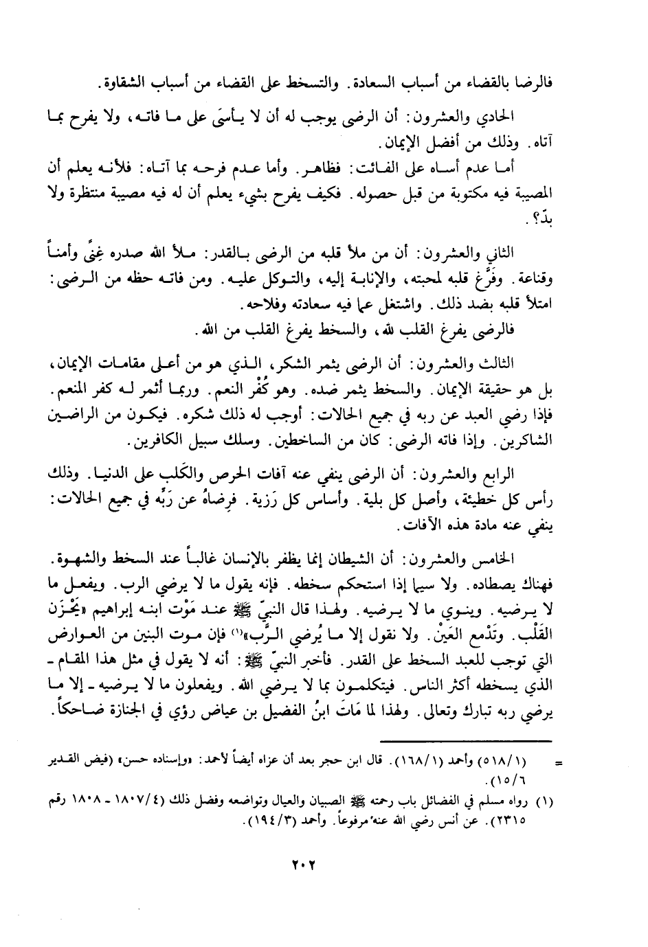 السَّادِسُ وَالْعِشْرُونَ: أَنَّ الرِّضَا هُوَ اخْتِيَارُ مَا اخْتَارَهُ اللَّهُ لِعَبْدِهِ. وَالسُّخْطَ كَرَاهَةُ مَا اخْتَارَهُ اللَّهُ لَهُ، وَهَذَا نَوْعُ مُحَادَّةٍ. فَلَا يُتَخَلَّصُ مِنْهُ إِلَّا بِالرِّضَا عَنِ اللَّهِ فِي جَمِيعِ الْحَالَاتِ.