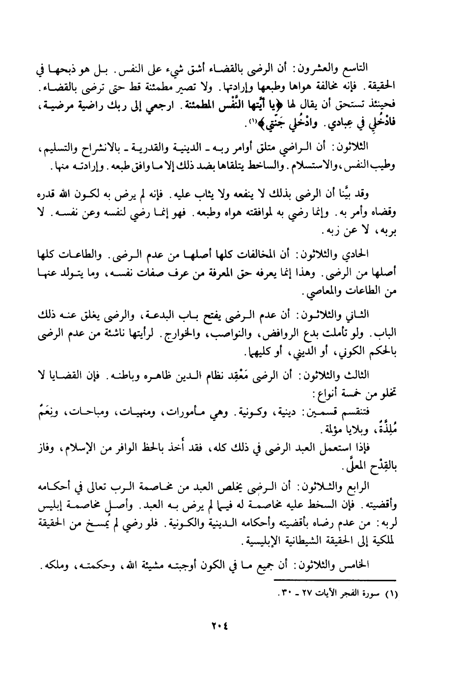الْحَادِي وَالثَّلَاثُونَ: أَنَّ الْمُخَالَفَاتِ كُلَّهَا أَصْلُهَا مِنْ عَدَمِ الرِّضَا. وَالطَّاعَاتِ كُلَّهَا أَصْلُهَا مِنَ الرِّضَا. وَهَذَا إِنَّمَا يَعْرِفُهُ حَقَّ الْمَعْرِفَةِ مَنْ عَرَفَ صِفَاتِ نَفْسِهِ، وَمَا يَتَوَلَّدُ عَنْهَا مِنَ الطَّاعَاتِ وَالْمَعَاصِي.