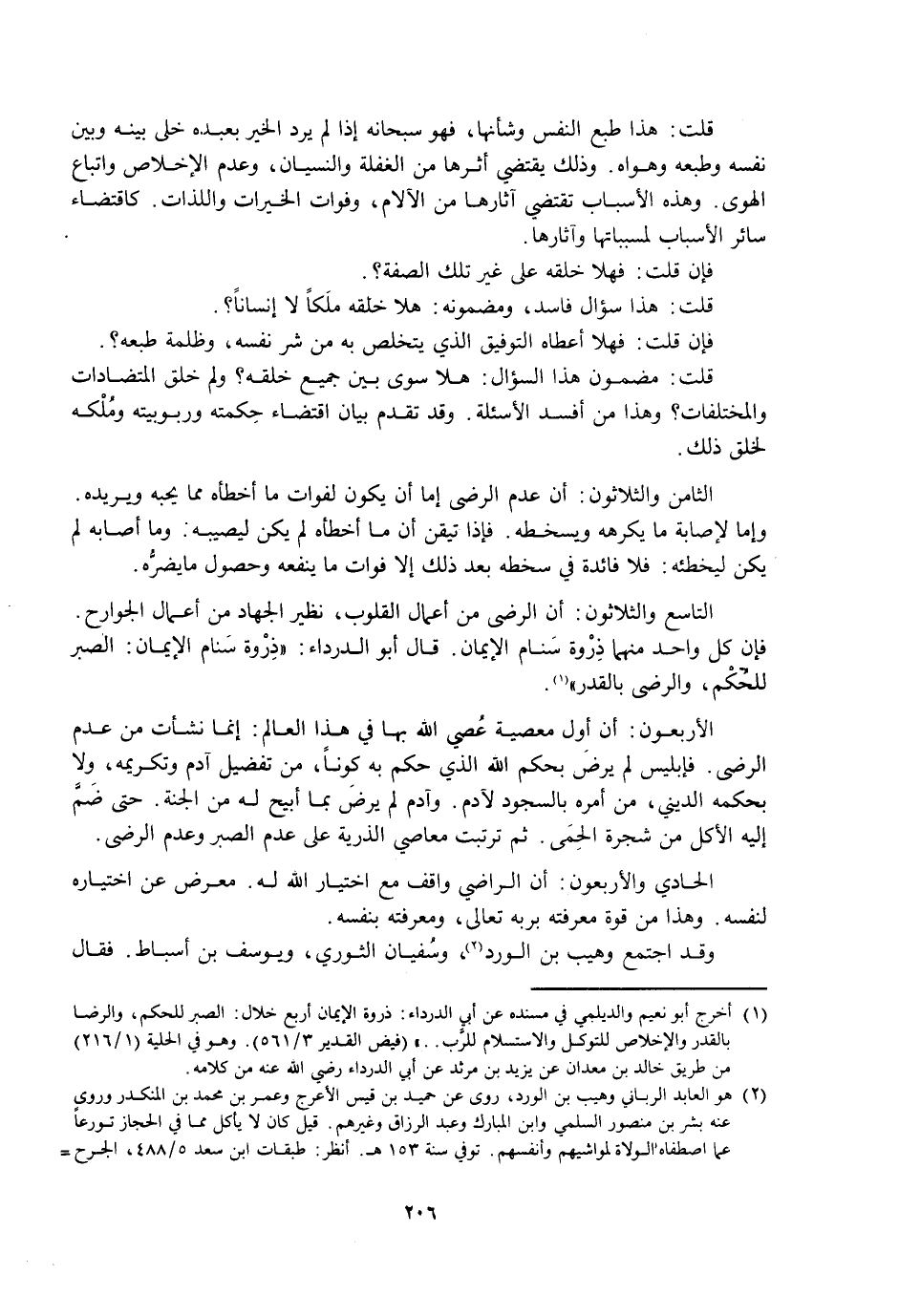 الْأَرْبَعُونَ: أَنَّ أَوَّلَ مَعْصِيَةٍ عُصِيَ اللَّهُ بِهَا فِي هَذَا الْعَالَمِ: إِنَّمَا نَشَأَتْ مِنْ عَدَمِ الرِّضَا. فَإِبْلِيسُ لَمْ يَرْضَ بِحُكْمِ اللَّهِ الَّذِي حَكَمَ بِهِ كَوْنًا، مِنْ تَفْضِيلِ آدَمَ وَتَكْرِيمِهِ، وَلَا بِحُكْمِهِ الدِّينِيِّ، مِنْ أَمْرِهِ بِالسُّجُودِ لِآدَمَ، وَآدَمُ لَمْ يَرْضَ بِمَا أُبِيحَ لَهُ مِنَ الْجَنَّةِ. حَتَّى ضَمَّ إِلَيْهِ الْأَكْلَ مِنْ شَجَرَةِ الْحُمَّى. ثُمَّ تَرَتَّبَتْ مَعَاصِي الذُّرِّيَّةِ عَلَى عَدَمِ الصَّبْرِ وَعَدَمِ الرِّضَا.