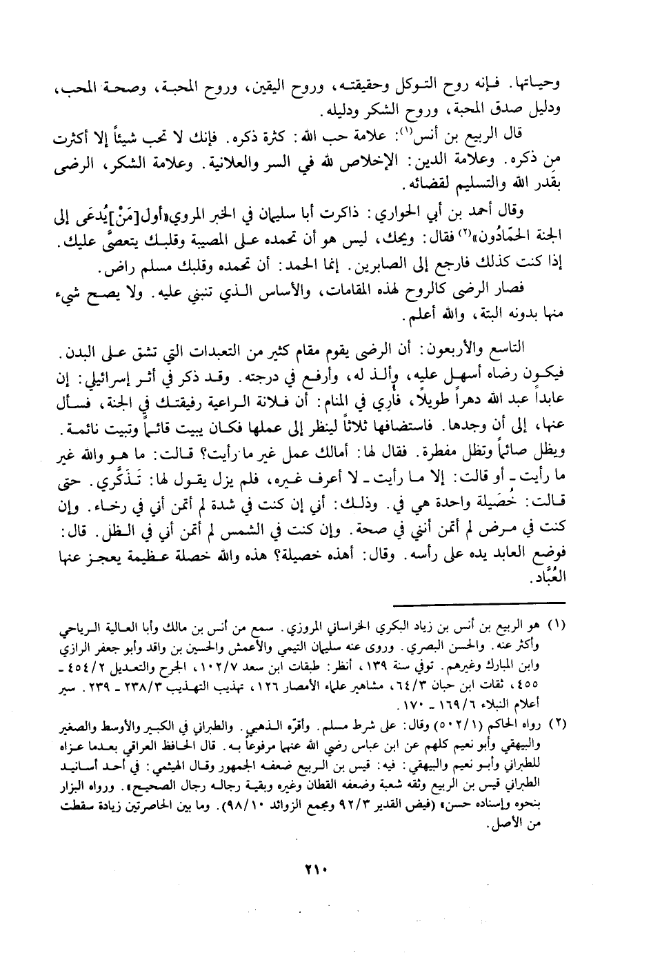 التَّاسِعُ وَالْأَرْبَعُونَ: أَنَّ الرِّضَا يَقُومُ مَقَامَ كَثِيرٍ مِنَ التَّعَبُّدَاتِ الَّتِي تَشُقُّ عَلَى الْبَدَنِ. فَيَكُونُ رِضَاهُ أَسْهَلَ عَلَيْهِ، وَأَلَذَّ لَهُ، وَأَرْفَعَ فِي دَرَجَتِهِ. وَقَدْ ذُكِرَ فِي أَثَرٍ إِسْرَائِيلِيٍّ: أَنَّ عَابِدًا عَبَدَ اللَّهَ دَهْرًا طَوِيلًا، فَأُرِيَ فِي الْمَنَامِ: أَنَّ فُلَانَةَ الرَّاعِيَةَ رَفِيقَتُكَ فِي الْجَنَّةِ، فَسَأَلَ عَنْهَا، إِلَى أَنْ وَجَدَهَا. فَاسْتَضَافَهَا ثَلَاثًا لِيَنْظُرَ إِلَى عَمَلِهَا فَكَانَ يَبِيتُ قَائِمًا وَتَبِيتُ نَائِمَةً. وَيَظَلُّ صَائِمًا وَتَظَلُّ مُفْطِرَةً. فَقَالَ لَهَا: أَمَا لَكِ عَمَلٌ غَيْرُ مَا رَأَيْتُ؟ قَالَتْ: مَا هُوَ وَاللَّهِ غَيْرَ مَا رَأَيْتَ - أَوْ قَالَتْ: إِلَّا مَا رَأَيْتَ - لَا أَعْرِفُ غَيْرَهُ، فَلَمْ يَزَلْ يَقُولُ لَهَا: تَذَكَّرِي. حَتَّى قَالَتْ: خُصَيْلَةٌ وَاحِدَةٌ هِيَ فِيَّ. وَذَلِكَ: أَنِّي إِنْ كُنْتُ فِي شِدَّةٍ لَمْ أَتَمَنَّ أَنِّي فِي رَخَاءٍ. وَإِنْ كُنْتُ فِي مَرَضٍ لَمْ أَتَمَنَّ أَنِّي فِي صِحَّةٍ. وَإِنْ كُنْتُ فِي شَمْسٍ لَمْ أَتَمَنَّ أَنِّي فِي الظِّلِّ. قَالَ: فَوَضَعَ الْعَابِدُ يَدَهُ عَلَى رَأْسِهِ. وَقَالَ: أَهَذِهِ خُصَيْلَةٌ؟ هَذِهِ وَاللَّهِ خَصْلَةٌ عَظِيمَةٌ يَعْجِزُ عَنْهَا الْعُبَّادُ.