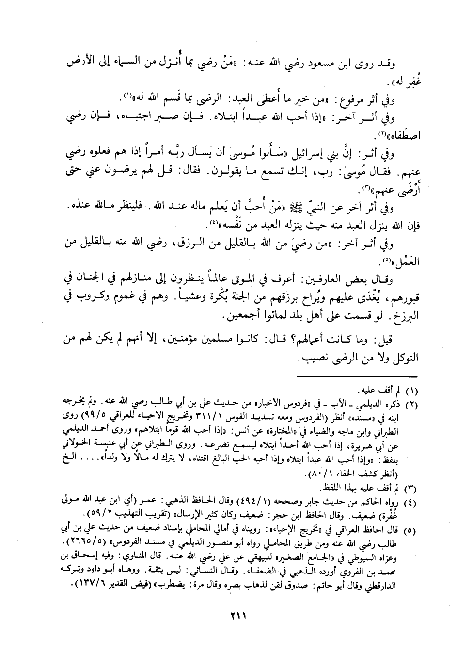 وَقَدْ رَوَى ابْنُ مَسْعُودٍ رَضِيَ اللَّهُ عَنْهُ: مَنْ رَضِيَ بِمَا أُنْزِلَ مِنَ السَّمَاءِ إِلَى الْأَرْضِ غُفِرَ لَهُ.