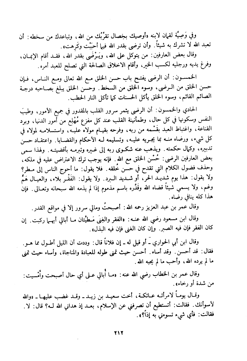 وَفِي وَصِيَّةِ لُقْمَانَ لِابْنِهِ: أُوصِيكَ بِخِصَالٍ تُقَرِّبُكَ مِنَ اللَّهِ، وَتُبَاعِدُكَ مِنْ سَخَطِهِ: أَنْ تَعْبُدَ اللَّهَ لَا تُشْرِكَ بِهِ شَيْئًا. وَأَنْ تَرْضَى بِقَدَرِ اللَّهِ فِيمَا أَحْبَبْتَ وَكَرِهْتَ