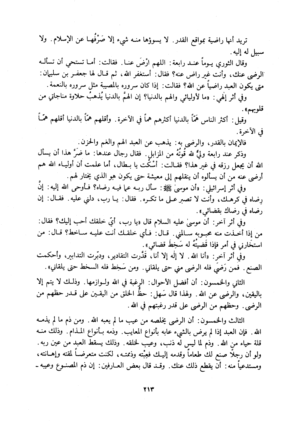 وَفِي أَثَرٍ إِسْرَائِيلِيٍّ أَنَّ مُوسَى صَلَّى اللَّهُ عَلَيْهِ وَسَلَّمَ: سَأَلَ رَبَّهُ عَمَّا فِيهِ رِضَاهُ؟ فَأَوْحَى اللَّهُ إِلَيْهِ: إِنَّ رِضَاهُ فِي كُرْهِكَ، وَأَنْتَ لَا تَصْبِرُ عَلَى مَا تَكْرَهُ. فَقَالَ: يَا رَبِّ، دُلَّنِي عَلَيْهِ. فَقَالَ: إِنَّ رِضَاهُ فِي رِضَاكَ بِقَضَائِي.