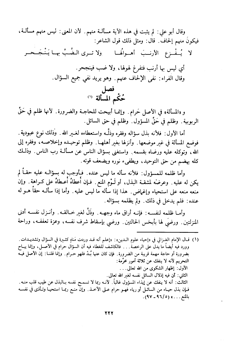 وَالْمَسْأَلَةُ فِي الْأَصْلِ حَرَامٌ. وَإِنَّمَا أُبِيحَتْ لِلْحَاجَةِ وَالضَّرُورَةِ. لِأَنَّهَا ظُلْمٌ فِي حَقِّ الرُّبُوبِيَّةِ. وَظُلْمٌ فِي حَقِّ الْمَسْئُولِ. وَظُلْمٌ فِي حَقِّ السَّائِلِ.