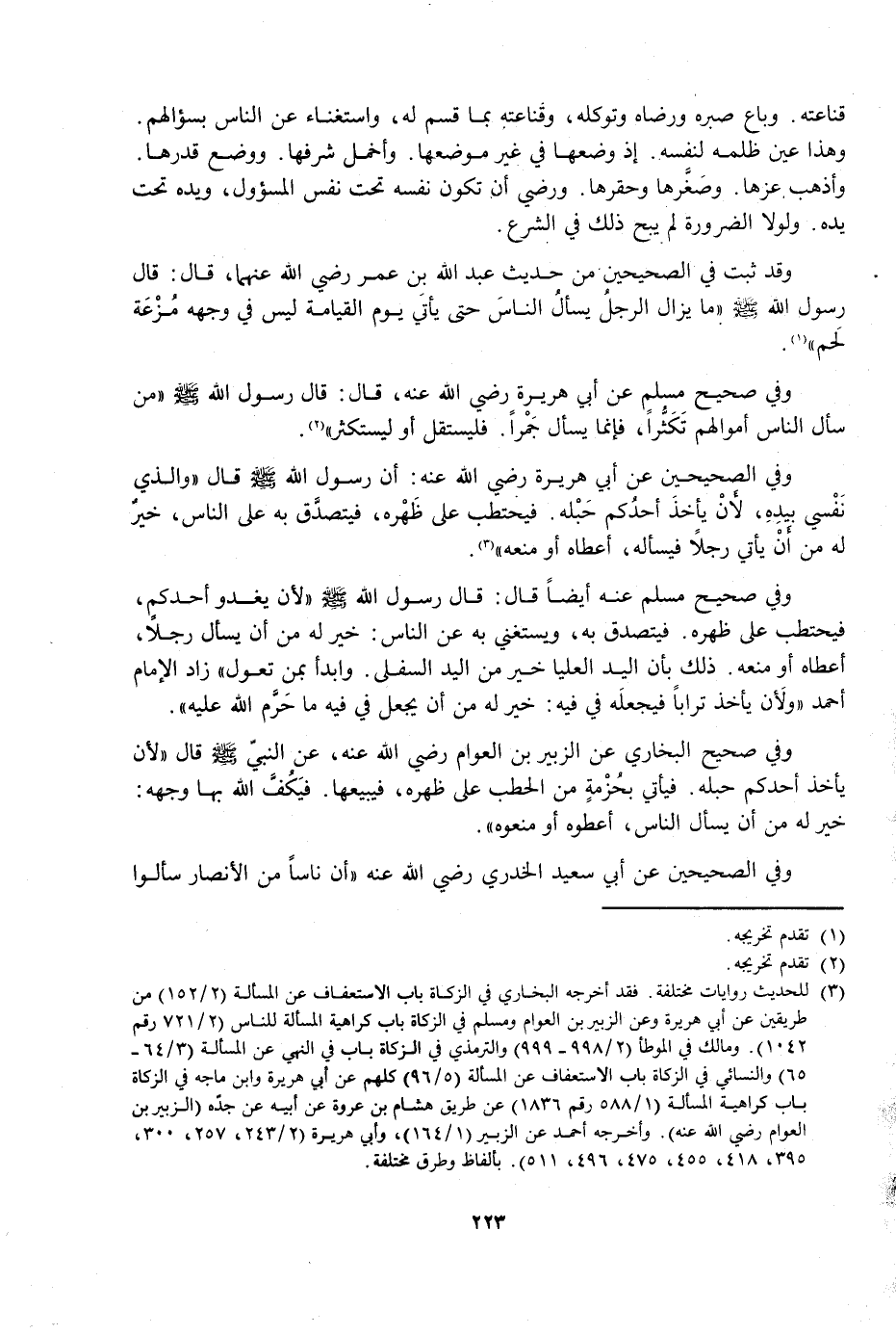 وَفِي صَحِيحِ مُسْلِمٍ عَنْهُ أَيْضًا قَالَ: قَالَ رَسُولُ اللَّهِ صَلَّى اللَّهُ عَلَيْهِ وَسَلَّمَ «لَأَنْ يَغْدُوَ أَحَدُكُمْ، فَيَحْتَطِبَ عَلَى ظَهْرِهِ. فَيَتَصَدَّقَ بِهِ، وَيَسْتَغْنِيَ بِهِ عَنِ النَّاسِ: خَيْرٌ لَهُ مِنْ أَنْ يَسْأَلَ رَجُلًا، أَعْطَاهُ أَوْ مَنَعَهُ. ذَلِكَ بِأَنَّ الْيَدَ الْعُلْيَا خَيْرٌ مِنَ الْيَدِ السُّفْلَى. وَابْدَأْ بِمَنْ تَعُولُ» . زَادَ الْإِمَامُ أَحْمَدُ «وَلَأَنْ يَأْخُذَ تُرَابًا فَيَجْعَلَهُ فِي فِيهِ: خَيْرٌ لَهُ مِنْ أَنْ يَجْعَلَ فِي فِيهِ مَا حَرَّمَ اللَّهُ عَلَيْهِ» .