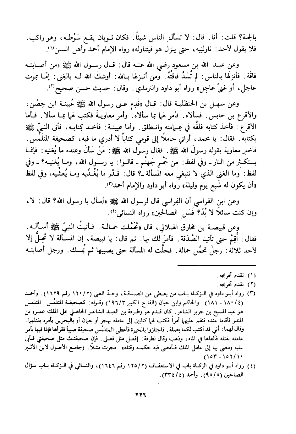لَهُ بِالْجَنَّةِ؟ قُلْتُ: أَنَا. قَالَ: لَا تَسْأَلِ النَّاسَ شَيْئًا. فَكَانَ ثَوْبَانُ يَقَعُ سَوْطُهُ، وَهُوَ رَاكِبٌ. فَلَا يَقُولُ لِأَحَدٍ: نَاوِلْنِيهِ، حَتَّى يَنْزِلَ هُوَ فَيَتَنَاوَلَهُ» . رَوَاهُ الْإِمَامُ أَحْمَدُ وَأَهْلُ السُّنَنِ.