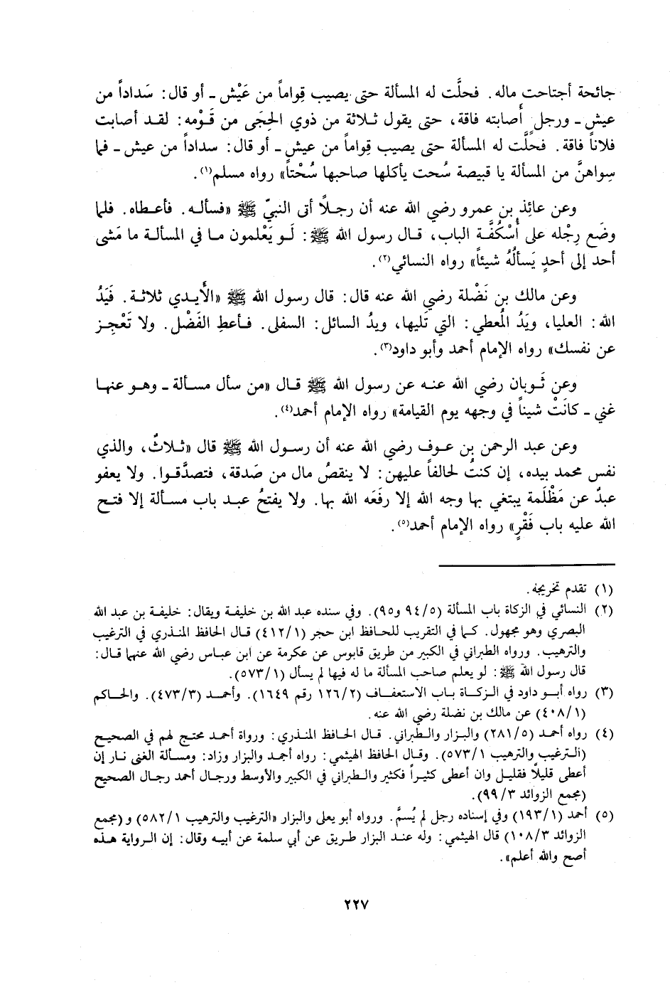 وَعَنْ عَبْدِ الرَّحْمَنِ بْنِ عَوْفٍ رَضِيَ اللَّهُ عَنْهُ أَنَّ رَسُولَ اللَّهِ صَلَّى اللَّهُ عَلَيْهِ وَسَلَّمَ: قَالَ: «ثَلَاثٌ، وَالَّذِي نَفْسُ مُحَمَّدٍ بِيَدِهِ، إِنْ كُنْتُ لَحَالِفًا عَلَيْهِنَّ: لَا يَنْقُصُ مَالٌ مِنْ صَدَقَةٍ، فَتَصَدَّقُوا. وَلَا يَعْفُو عَبْدٌ عَنْ مَظْلَمَةٍ يَبْتَغِي بِهَا وَجْهَ اللَّهِ إِلَّا رَفَعَهُ اللَّهُ بِهَا. وَلَا يَفْتَحُ عَبْدٌ بَابَ مَسْأَلَةٍ إِلَّا فَتَحَ اللَّهُ عَلَيْهِ بَابَ فَقْرٍ» . رَوَاهُ الْإِمَامُ أَحْمَدُ.