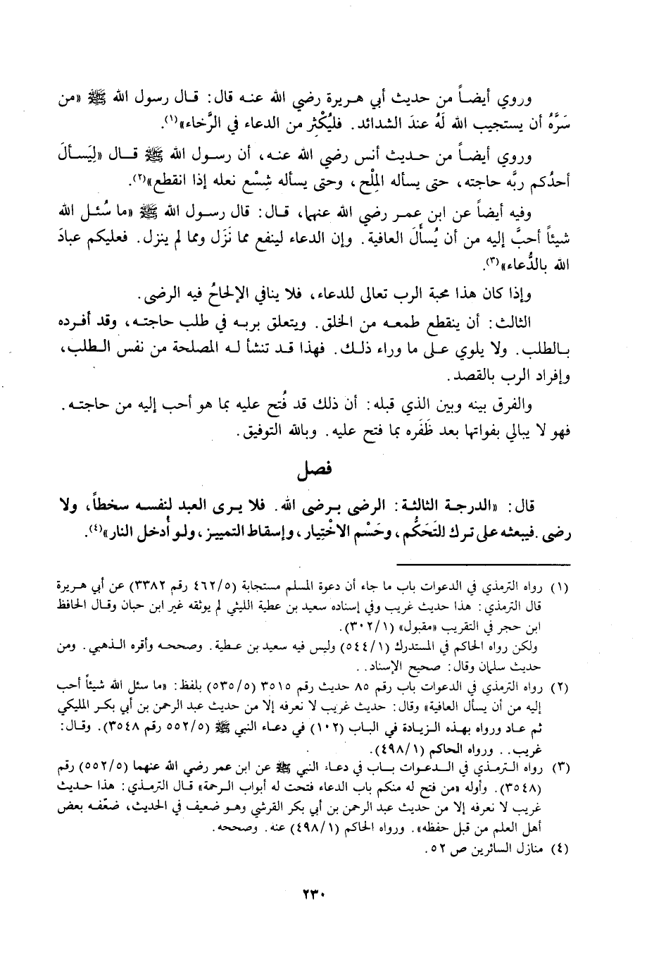 قَالَ: الدَّرَجَةُ الثَّالِثَةُ: الرِّضَا بِرِضَا اللَّهِ. فَلَا يَرَى الْعَبْدُ لِنَفْسِهِ سُخْطًا، وَلَا رِضًا. فَيَبْعَثُهُ عَلَى تَرْكِ التَّحَكُّمِ، وَحَسْمِ الِاخْتِيَارِ، وَإِسْقَاطِ التَّمْيِيزِ، وَلَوْ أُدْخِلَ النَّارَ.
