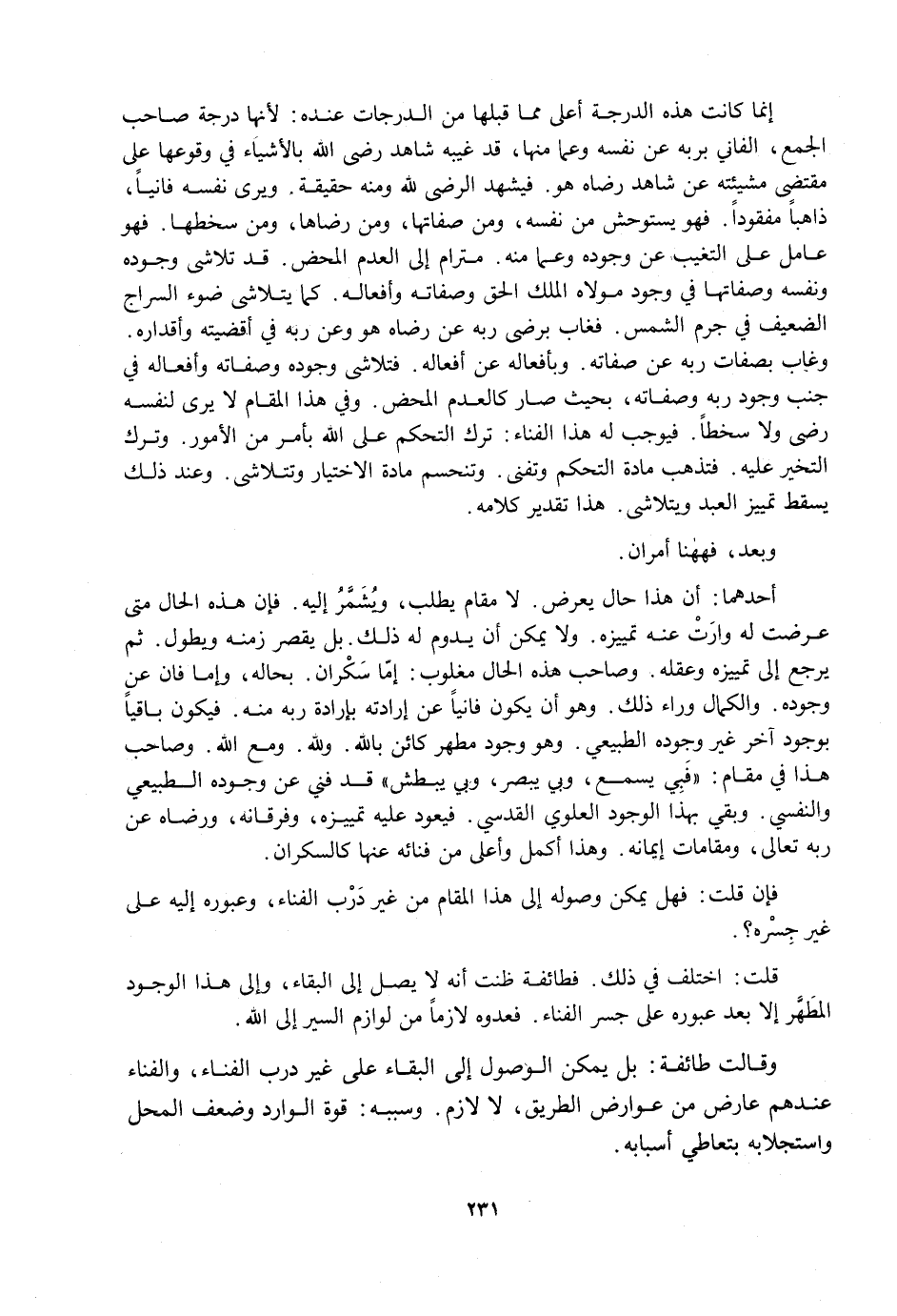 قُلْتُ: اخْتُلِفَ فِي ذَلِكَ. فَطَائِفَةٌ ظَنَّتْ أَنَّهُ لَا يَصِلُ إِلَى الْبَقَاءِ، وَإِلَى هَذَا الْوُجُودِ الْمُطَهَّرِ إِلَّا بَعْدَ عُبُورِهِ عَلَى جِسْرِ الْفَنَاءِ. فَعَدُّوهُ لَازِمًا مِنْ لَوَازِمِ السَّيْرِ إِلَى اللَّهِ.