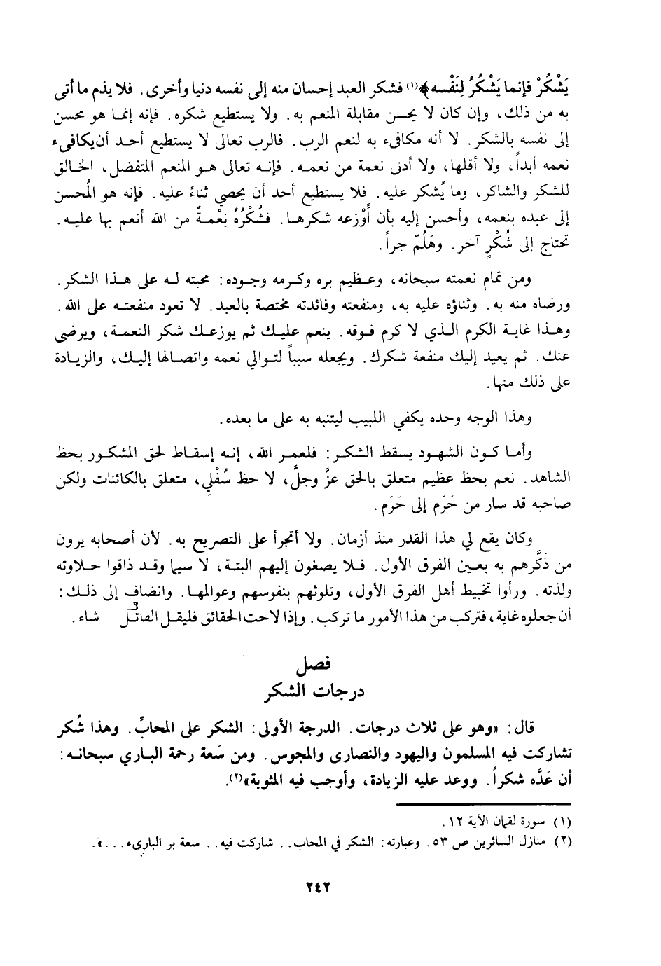 وَأَمَّا كَوْنُ الشُّهُودِ يُسْقِطُ الشُّكْرَ: فَلَعَمْرُ اللَّهِ، إِنَّهُ إِسْقَاطٌ لِحَقِّ الْمَشْكُورِ بِحَظِّ الشَّاهِدِ. نَعَمْ بِحَظٍّ عَظِيمٍ مُتَعَلِّقٍ بِالْحَقِّ عَزَّ وَجَلَّ، لَا حَظٍّ سُفْلِيٍّ، مُتَعَلِّقٍ بِالْكَائِنَاتِ وَلَكِنَّ صَاحِبَهُ قَدْ سَارَ مِنْ حَرَمٍ إِلَى حَرَمٍ.
