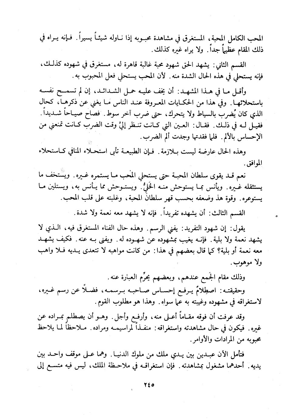 وَقَدْ عَرَفْتُ أَنَّ فَوْقَهُ مَقَامًا أَعْلَى مِنْهُ، وَأَرْفَعُ وَأَجَلُّ. وَهُوَ أَنْ يَصْطَلِمَ بِمُرَادِهِ عَنْ غَيْرِهِ. فَيَكُونَ فِي حَالِ مُشَاهَدَتِهِ وَاسْتِغْرَاقِهِ: مُنَفِّذًا لِمَرَاسِيمِهِ وَمُرَادِهِ. مُلَاحِظًا لِمَا يُلَاحِظُ مَحْبُوبُهُ مِنَ الْمُرَادَاتِ وَالْأَوَامِرِ.