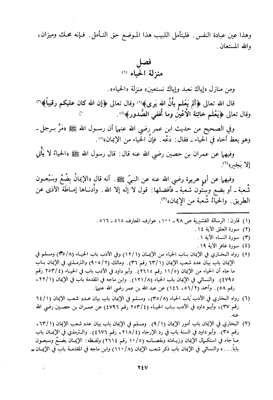 وَمِنْ مَنَازِلِ {إِيَّاكَ نَعْبُدُ وَإِيَّاكَ نَسْتَعِينُ} [الفاتحة: 5] مَنْزِلَةُ الْحَيَاءِ