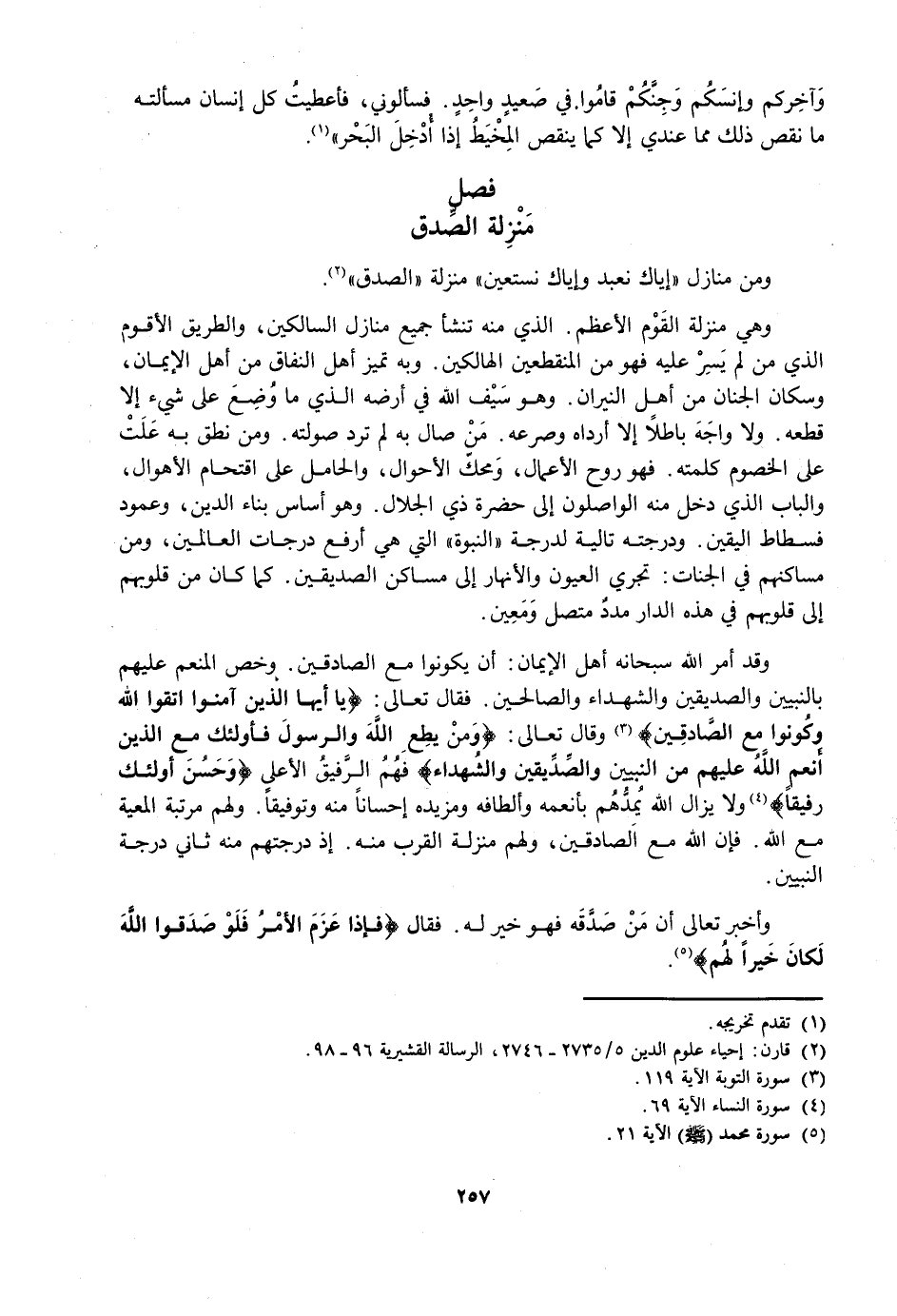 وَمِنْ مَنَازِلِ {إِيَّاكَ نَعْبُدُ وَإِيَّاكَ نَسْتَعِينُ} [الفاتحة: 5] مَنْزِلَةُ الصِّدْقِ وَهِيَ مَنْزِلَةُ الْقَوْمِ الْأَعْظَمِ. الَّذِي مِنْهُ تَنْشَأُ جَمِيعُ مَنَازِلِ السَّالِكِينَ، وَالطَّرِيقُ الْأَقْوَمُ الَّذِي مَنْ لَمْ يَسِرْ عَلَيْهِ فَهُوَ مِنَ الْمُنْقَطِعِينَ الْهَالِكِينَ. وَبِهِ تَمَيَّزَ أَهْلُ النِّفَاقِ مِنْ أَهْلِ الْإِيمَانِ، وَسُكَّانُ الْجِنَانِ مِنْ أَهْلِ النِّيرَانِ. وَهُوَ سَيْفُ اللَّهِ فِي أَرْضِهِ الَّذِي مَا وُضِعَ عَلَى شَيْءٍ إِلَّا قَطَعَهُ. وَلَا وَاجَهَ بَاطِلًا إِلَّا أَرْدَاهُ وَصَرَعَهُ. مَنْ صَالَ بِهِ لَمْ تُرَدَّ صَوْلَتُهُ. وَمَنْ نَطَقَ بِهِ عَلَتْ عَلَى الْخُصُومِ كَلِمَتُهُ. فَهُوَ رُوحُ الْأَعْمَالِ، وَمَحَكُّ الْأَحْوَالِ، وَالْحَامِلُ عَلَى اقْتِحَامِ الْأَهْوَالِ، وَالْبَابُ الَّذِي دَخَلَ مِنْهُ الْوَاصِلُونَ إِلَى حَضْرَةِ ذِي الْجَلَالِ. وَهُوَ أَسَاسُ بِنَاءِ الدِّينِ، وَعَمُودُ فُسْطَاطِ الْيَقِينِ. وَدَرَجَتُهُ تَالِيَةٌ لِدَرَجَةِ النُّبُوَّةِ الَّتِي هِيَ أَرْفَعُ دَرَجَاتِ الْعَالِمِينَ. وَمِنْ مَسَاكِنِهِمْ فِي الْجَنَّاتِ تُجْرَى الْعُيُونُ وَالْأَنْهَارُ إِلَى مَسَاكِنِ الصِّدِّيقِينَ. كَمَا كَانَ مِنْ قُلُوبِهِمْ إِلَى قُلُوبِهِمْ فِي هَذِهِ الدَّارِ مَدَدٌ مُتَّصِلٌ وَمَعِينٌ.
