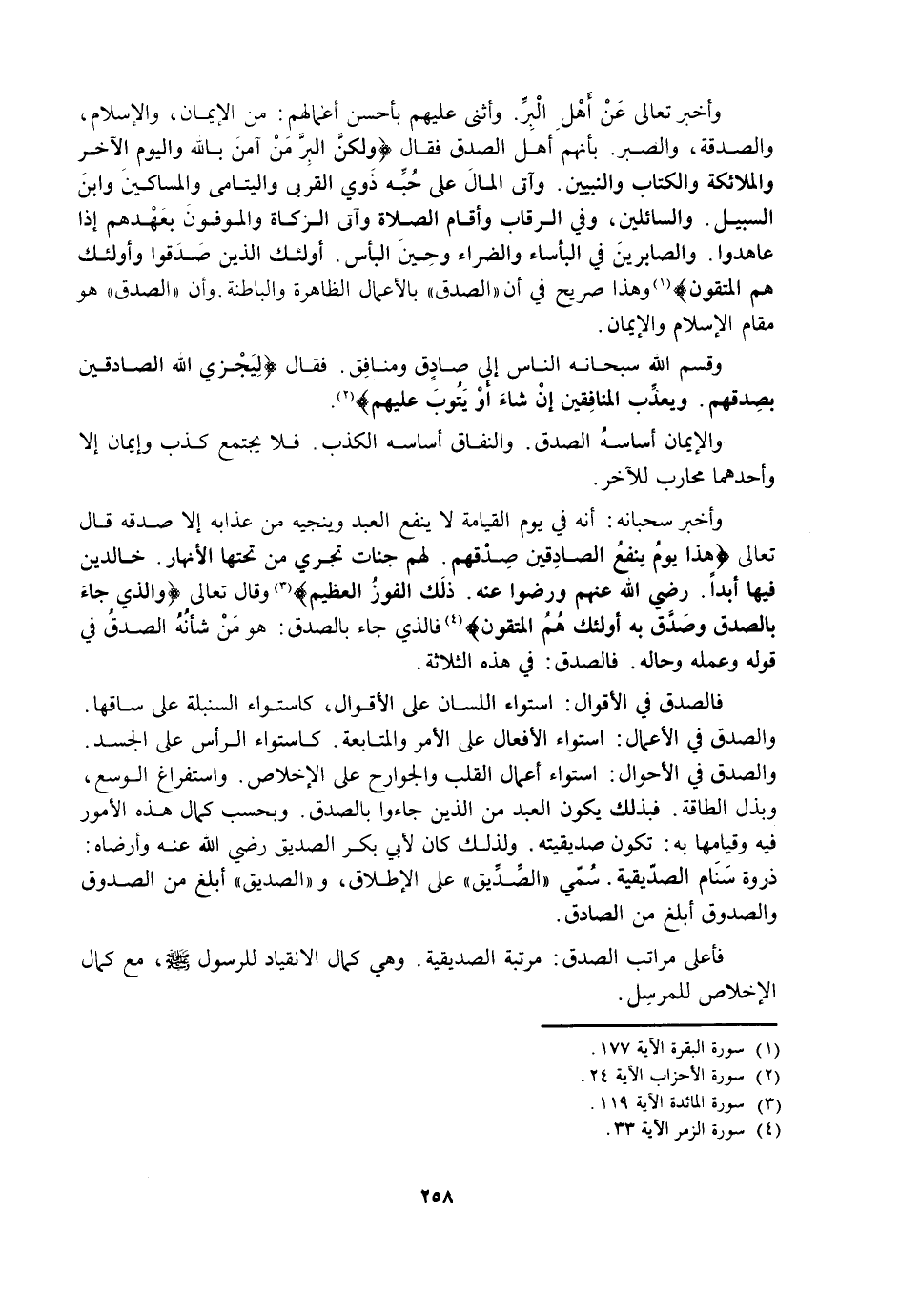 وَأَخْبَرَ تَعَالَى عَنْ أَهْلِ الْبِرِّ. وَأَثْنَى عَلَيْهِمْ بِأَحْسَنِ أَعْمَالِهِمْ: مِنَ الْإِيمَانِ، وَالْإِسْلَامِ، وَالصَّدَقَةِ، وَالصَّبْرِ. بِأَنَّهُمْ أَهْلُ الصِّدْقِ فَقَالَ {وَلَكِنَّ الْبِرَّ مَنْ آمَنَ بِاللَّهِ وَالْيَوْمِ الْآخِرِ وَالْمَلَائِكَةِ وَالْكِتَابِ وَالنَّبِيِّينَ وَآتَى الْمَالَ عَلَى حُبِّهِ ذَوِي الْقُرْبَى وَالْيَتَامَى وَالْمَسَاكِينَ وَابْنَ السَّبِيلِ وَالسَّائِلِينَ وَفِي الرِّقَابِ وَأَقَامَ الصَّلَاةَ وَآتَى الزَّكَاةَ وَالْمُوفُونَ بِعَهْدِهِمْ إِذَا عَاهَدُوا وَالصَّابِرِينَ فِي الْبَأْسَاءِ وَالضَّرَّاءِ وَحِينَ الْبَأْسِ أُولَئِكَ الَّذِينَ صَدَقُوا وَأُولَئِكَ هُمُ الْمُتَّقُونَ} [البقرة: 177] وَهَذَا صَرِيحٌ فِي أَنَّ الصِّدْقَ بِالْأَعْمَالِ الظَّاهِرَةِ وَالْبَاطِنَةِ. وَأَنَّ الصِّدْقَ هُوَ مَقَامُ الْإِسْلَامِ وَالْإِيمَانِ.