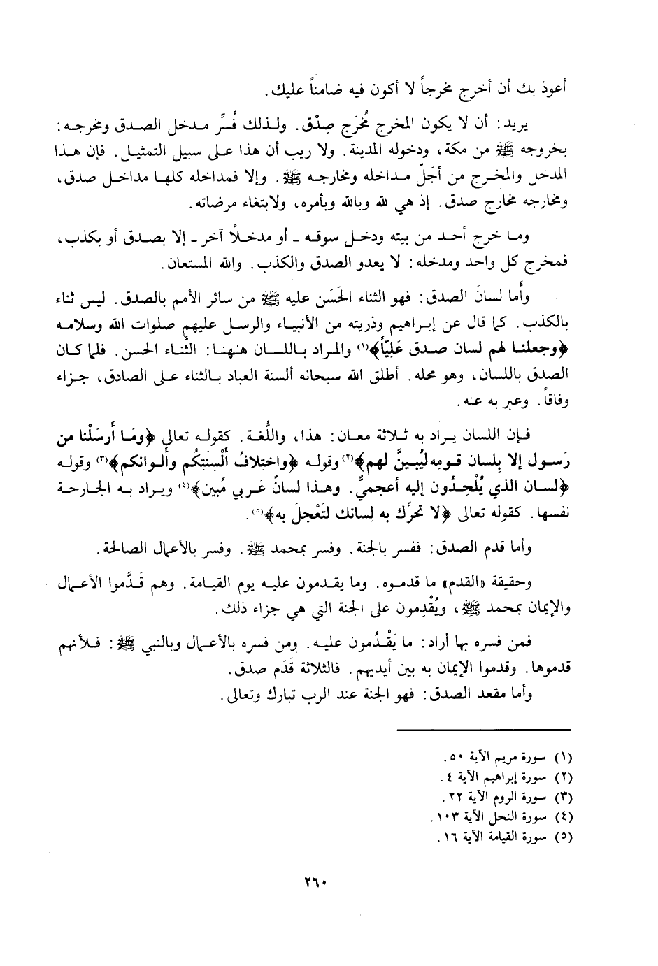 يُرِيدُ: أَنْ لَا يَكُونَ الْمُخْرَجُ مُخْرَجَ صِدْقٍ. وَلِذَلِكَ فُسِّرَ مُدْخَلُ الصِّدْقِ وَمُخْرَجُهُ: بِخُرُوجِهِ صَلَّى اللَّهُ عَلَيْهِ وَسَلَّمَ مِنْ مَكَّةَ، وَدُخُولِهِ الْمَدِينَةَ. وَلَا رَيْبَ أَنَّ هَذَا عَلَى سَبِيلِ التَّمْثِيلِ. فَإِنَّ هَذَا الْمُدْخَلَ وَالْمُخْرَجَ مِنْ أَجَلِّ مَدَاخِلِهِ وَمَخَارِجِهِ صَلَّى اللَّهُ عَلَيْهِ وَسَلَّمَ. وَإِلَّا فَمَدَاخِلُهُ كُلُّهَا مَدَاخِلُ صِدْقٍ، وَمَخَارِجُهُ مَخَارِجُ صِدْقٍ. إِذْ هِيَ لِلَّهِ وَبِاللَّهِ وَبِأَمْرِهِ، وَلِابْتِغَاءِ مَرْضَاتِهِ.