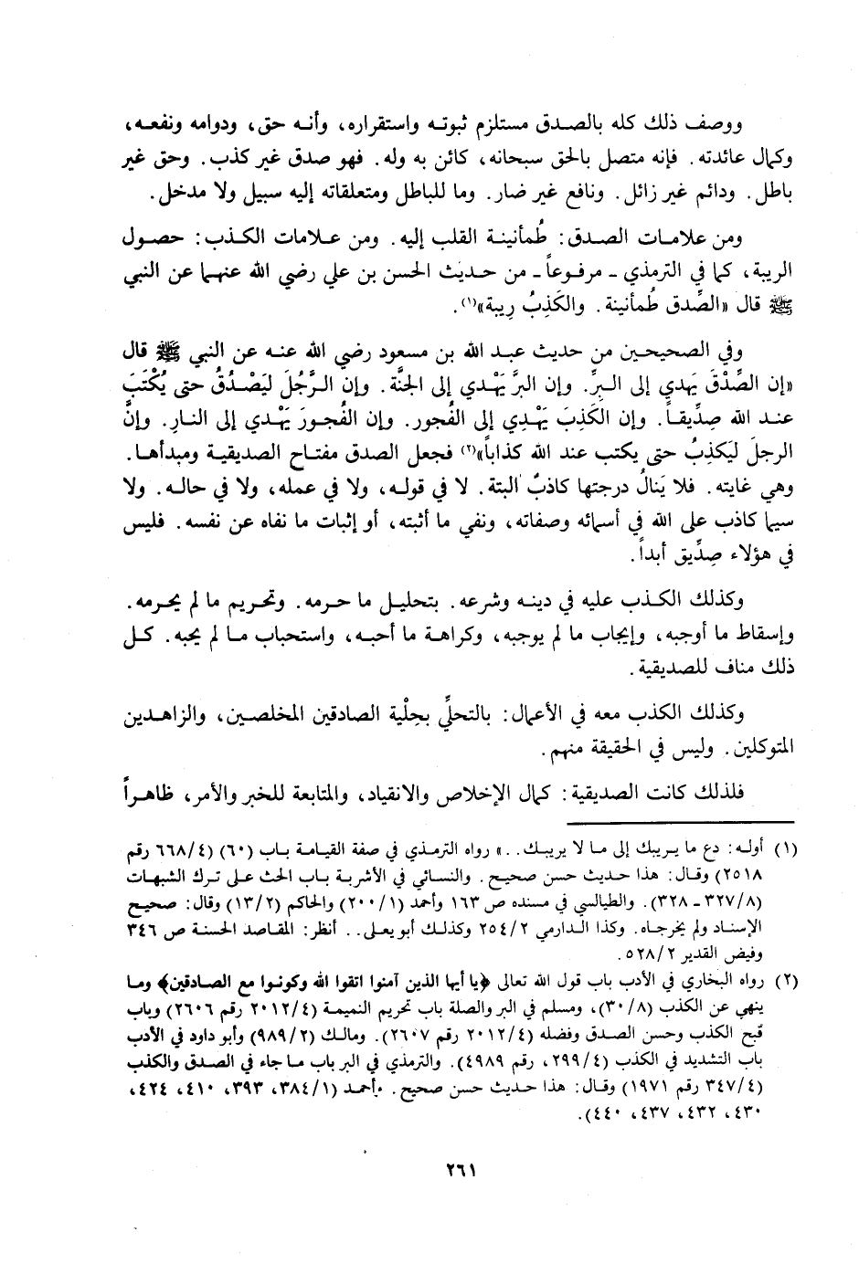 وَمِنْ عَلَامَاتِ الصِّدْقِ: طُمَأْنِينَةُ الْقَلْبِ إِلَيْهِ. وَمِنْ عَلَامَاتِ الْكَذِبِ: حُصُولُ الرِّيبَةِ، كَمَا فِي التِّرْمِذِيِّ - مَرْفُوعًا - مِنْ حَدِيثِ الْحَسَنِ بْنِ عَلِيٍّ رَضِيَ اللَّهُ عَنْهُمَا عَنِ النَّبِيِّ صَلَّى اللَّهُ عَلَيْهِ وَسَلَّمَ قَالَ: «الصِّدْقُ طُمَأْنِينَةٌ. وَالْكَذِبُ رِيبَةٌ» . وَفِي الصَّحِيحَيْنِ مِنْ حَدِيثِ عَبْدِ اللَّهِ بْنِ مَسْعُودٍ رَضِيَ اللَّهُ عَنْهُ عَنِ النَّبِيِّ صَلَّى اللَّهُ عَلَيْهِ وَسَلَّمَ قَالَ: «إِنَّ الصِّدْقَ يَهْدِي إِلَى الْبِرِّ. وَإِنَّ الْبِرَّ يَهْدِي إِلَى الْجَنَّةِ. وَإِنَّ الرَّجُلَ لَيَصْدُقُ حَتَّى يُكْتَبَ عِنْدَ اللَّهِ صِدِّيقًا. وَإِنَّ الْكَذِبَ يَهْدِي إِلَى الْفُجُورِ. وَإِنَّ الْفُجُورَ يَهْدِي إِلَى النَّارِ. وَإِنَّ الرَّجُلَ لَيَكْذِبُ حَتَّى يُكْتُبَ عِنْدَ اللَّهِ كَذَّابًا» فَجَعَلَ الصِّدْقَ مِفْتَاحَ الصِّدِّيقِيَّةِ وَمَبْدَأَهَا. وَهِيَ غَايَتُهُ. فَلَا يَنَالُ دَرَجَتَهَا كَاذِبٌ أَلْبَتَّةَ. لَا فِي قَوْلِهِ:، وَلَا فِي عَمَلِهِ، وَلَا فِي حَالِهِ. وَلَا سِيَّمَا كَاذِبٌ عَلَى اللَّهِ فِي أَسْمَائِهِ وَصِفَاتِهِ، وَنَفْيِ مَا أَثْبَتَهُ. أَوْ إِثْبَاتِ مَا نَفَاهُ عَنْ نَفْسِهِ. فَلَيْسَ فِي هَؤُلَاءِ صِدِّيقٌ أَبَدًا.