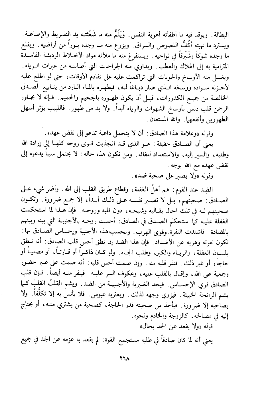 الضِّدُّ عِنْدَ الْقَوْمِ: هُمْ أَهْلُ الْغَفْلَةِ، وَقُطَّاعُ طَرِيقِ الْقَلْبِ إِلَى اللَّهِ. وَأَضَرُّ شَيْءٍ عَلَى الصَّادِقِ: صُحْبَتُهُمْ، بَلْ لَا تَصْبِرُ نَفْسُهُ عَلَى ذَلِكَ أَبَدًا، إِلَّا مَعَ ضَرُورَةٍ. وَتَكُونُ صُحْبَتُهُمْ لَهُ فِي تِلْكَ الْحَالِ بِقَالَبِهِ وَشَبَحِهِ، دُونَ قَلْبِهِ وَرُوحِهِ. فَإِنَّ هَذَا لَمَّا اسْتَحْكَمَتِ الْغَفْلَةُ عَلَيْهِ كَمَا اسْتَحْكَمَ الصِّدْقُ فِي الصَّادِقِ: أَحَسَّتْ رُوحُهُ بِالْأَجْنَبِيَّةِ الَّتِي بَيْنَهُ وَبَيْنَهُمْ بِالْمُضَادَّةِ. فَاشْتَدَّتِ النُّفْرَةُ. وَقَوِيَ الْهَرَبُ. وَبِحَسَبِ هَذِهِ الْأَجْنَبِيَّةِ وَإِحْسَاسِ الصَّادِقِ بِهَا: تَكُونُ نُفْرَتُهُ وَهَرَبُهُ عَنِ الْأَضْدَادِ. فَإِنَّ هَذَا الضِّدَّ إِنْ نَطَقَ أَحَسَّ قَلْبُ الصَّادِقِ: أَنَّهُ نَطَقَ بِلِسَانِ الْغَفْلَةِ، وَالرِّيَاءِ وَالْكِبْرِ، وَطَلَبِ الْجَاهِ. وَلَوْ كَانَ ذَاكِرًا أَوْ قَارِئًا، أَوْ مُصَلِّيًا أَوْ حَاجًّا، أَوْ غَيْرَ ذَلِكَ. فَنَفَرَ قَلْبُهُ مِنْهُ. وَإِنْ صَمَتَ أَحَسَّ قَلْبُهُ: أَنَّهُ صَمَتَ عَلَى غَيْرِ حُضُورٍ وَجَمْعِيَّةٍ عَلَى اللَّهِ، وَإِقْبَالٍ بِالْقَلْبِ عَلَيْهِ، وَعُكُوفِ السِّرِّ عَلَيْهِ. فَيَنْفِرُ مِنْهُ أَيْضًا. فَإِنَّ قَلْبَ الصَّادِقِ قَوِيُّ الْإِحْسَاسِ. فَيَجِدُ الْغَيْرِيَّةَ وَالْأَجْنَبِيَّةَ مِنَ الضِّدِّ. وَيَشَمُّ الْقَلْبُ الْقَلْبَ كَمَا يَشَمُّ الرَّائِحَةَ الْخَبِيثَةَ. فَيَزْوِي وَجْهَهُ لِذَلِكَ. وَيَعْتَرِيهِ عُبُوسٌ. فَلَا يَأْنَسُ بِهِ إِلَّا تَكَلُّفًا. وَلَا يُصَاحِبُهُ إِلَّا ضَرُورَةً. فَيَأْخُذُ مِنْ صُحْبَتِهِ قَدْرَ الْحَاجَةِ، كَصُحْبَةِ مَنْ يَشْتَرِي مِنْهُ، أَوْ يَحْتَاجُ إِلَيْهِ فِي مَصَالِحِهِ، كَالزَّوْجَةِ وَالْخَادِمِ وَنَحْوِهِ.