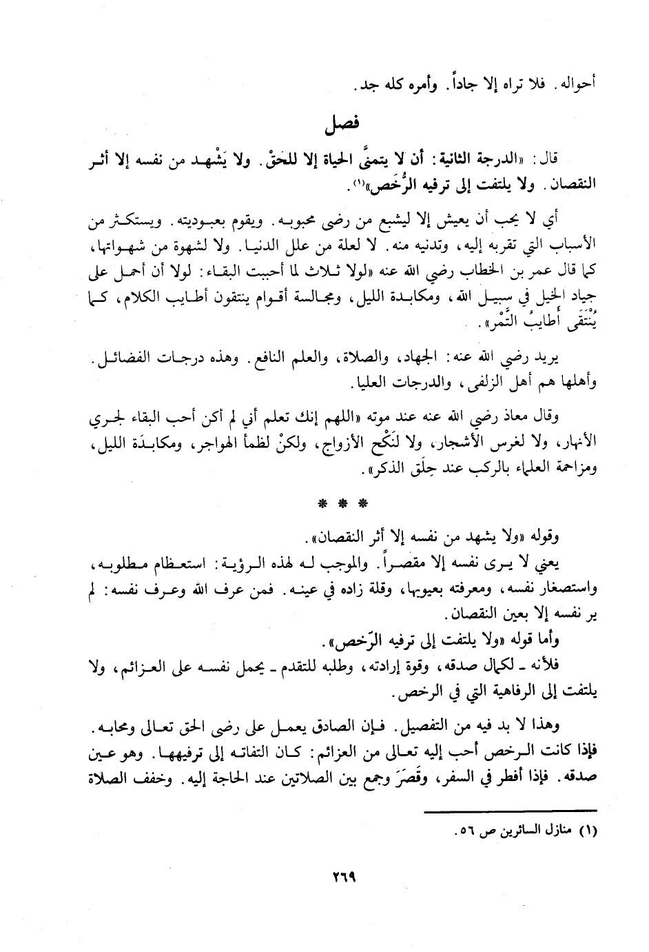 قَالَ الدَّرَجَةُ الثَّانِيَةُ: أَنْ لَا يَتَمَنَّى الْحَيَاةَ إِلَّا لِلْحَقِّ. وَلَا يَشْهَدَ مِنْ نَفْسِهِ إِلَّا أَثَرَ النُّقْصَانِ. وَلَا يَلْتَفِتَ إِلَى تَرْفِيهِ الرُّخَصِ.