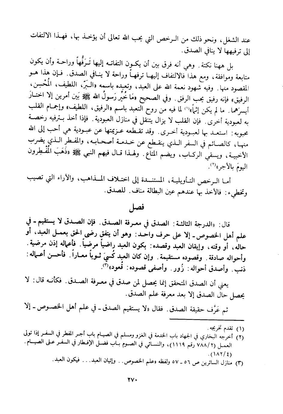 بَلْ هَاهُنَا نُكْتَةٌ. وَهِيَ أَنَّهُ فَرْقٌ بَيْنَ أَنْ يَكُونَ الْتِفَاتُهُ إِلَيْهَا تَرَفُّهًا وَرَاحَةً. وَأَنْ يَكُونَ مُتَابَعَةً وَمُوَافَقَةً. وَمَعَ هَذَا فَالِالْتِفَاتُ إِلَيْهَا تَرَفُّهًا وَرَاحَةً لَا يُنَافِي الصِّدْقَ. فَإِنَّ هَذَا هُوَ الْمَقْصُودُ مِنْهَا. وَفِيهِ شُهُودُ نِعْمَةِ اللَّهِ عَلَى الْعَبْدِ، وَتَعْبُّدُهُ بِاسْمِهِ الْبَرِّ، اللَّطِيفِ، الْمُحْسِنِ، الرَّفِيقِ فَإِنَّهُ رَفِيقٌ يُحِبُّ الرِّفْقَ. وَفِي الصَّحِيحِ: «مَا خُيِّرَ رَسُولُ اللَّهِ صَلَّى اللَّهُ عَلَيْهِ وَسَلَّمَ بَيْنَ أَمْرَيْنِ إِلَّا اخْتَارَ أَيْسَرَهُمَا. مَا لَمْ يَكُنْ إِثْمًا» لِمَا فِيهِ مِنْ رُوحِ التَّعَبُّدِ بِاسْمِ: الرَّفِيقِ، اللَّطِيفِ وَإِجْمَامِ الْقَلْبِ بِهِ لِعُبُودِيَّةٍ أُخْرَى. فَإِنَّ الْقَلْبَ لَا يَزَالُ يَتَنَقَّلُ فِي مَنَازِلِ الْعُبُودِيَّةِ. فَإِذَا أَخَذَ بِتَرْفِيهِ رُخْصَةِ مَحْبُوبِهِ: اسْتَعَدَّ بِهَا لِعُبُودِيَّةٍ أُخْرَى. وَقَدْ تَقْطَعُهُ عَزِيمَتُهَا عَنْ عُبُودِيَّةٍ هِيَ أَحَبُّ إِلَى اللَّهِ مِنْهَا، كَالصَّائِمِ فِي السَّفَرِ الَّذِي يَنْقَطِعُ عَنْ خِدْمَةِ أَصْحَابِهِ، وَالْمُفْطِرِ الَّذِي يَضْرِبُ الْأَخْبِيَةَ، وَيَسْقِي الرُّكَّابِ، وَيَضُمُّ الْمَتَاعَ. وَلِهَذَا قَالَ فِيهِمُ النَّبِيُّ صَلَّى اللَّهُ عَلَيْهِ وَسَلَّمَ «ذَهَبَ الْمُفْطِرُونَ الْيَوْمَ بِالْأَجْرِ» .