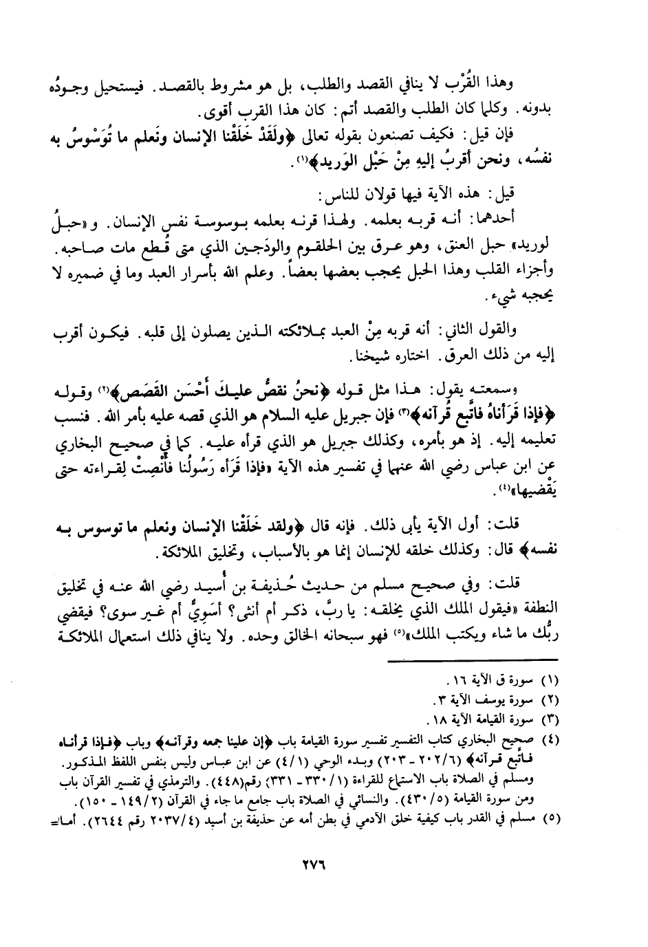 أَحَدُهُمَا: أَنَّهُ قُرْبُهُ بِعِلْمِهِ. وَلِهَذَا قَرَنَهُ بِعِلْمِهِ بِوَسْوَسَةِ نَفْسِ الْإِنْسَانِ. وَحَبْلُ الْوَرِيدِ حَبْلُ الْعُنُقِ، وَهُوَ عِرْقٌ بَيْنَ الْحُلْقُومِ وَالْوَدَجَيْنِ الَّذِي مَتَى قُطِعَ مَاتَ صَاحِبُهُ. وَأَجْزَاءُ الْقَلْبِ وَهَذَا الْحَبْلُ يَحْجُبُ بَعْضَهَا بَعْضًا. وَعِلْمُ اللَّهِ بِأَسْرَارِ الْعَبْدِ وَمَا فِي ضَمِيرِهِ لَا يَحْجُبُهُ شَيْءٌ.