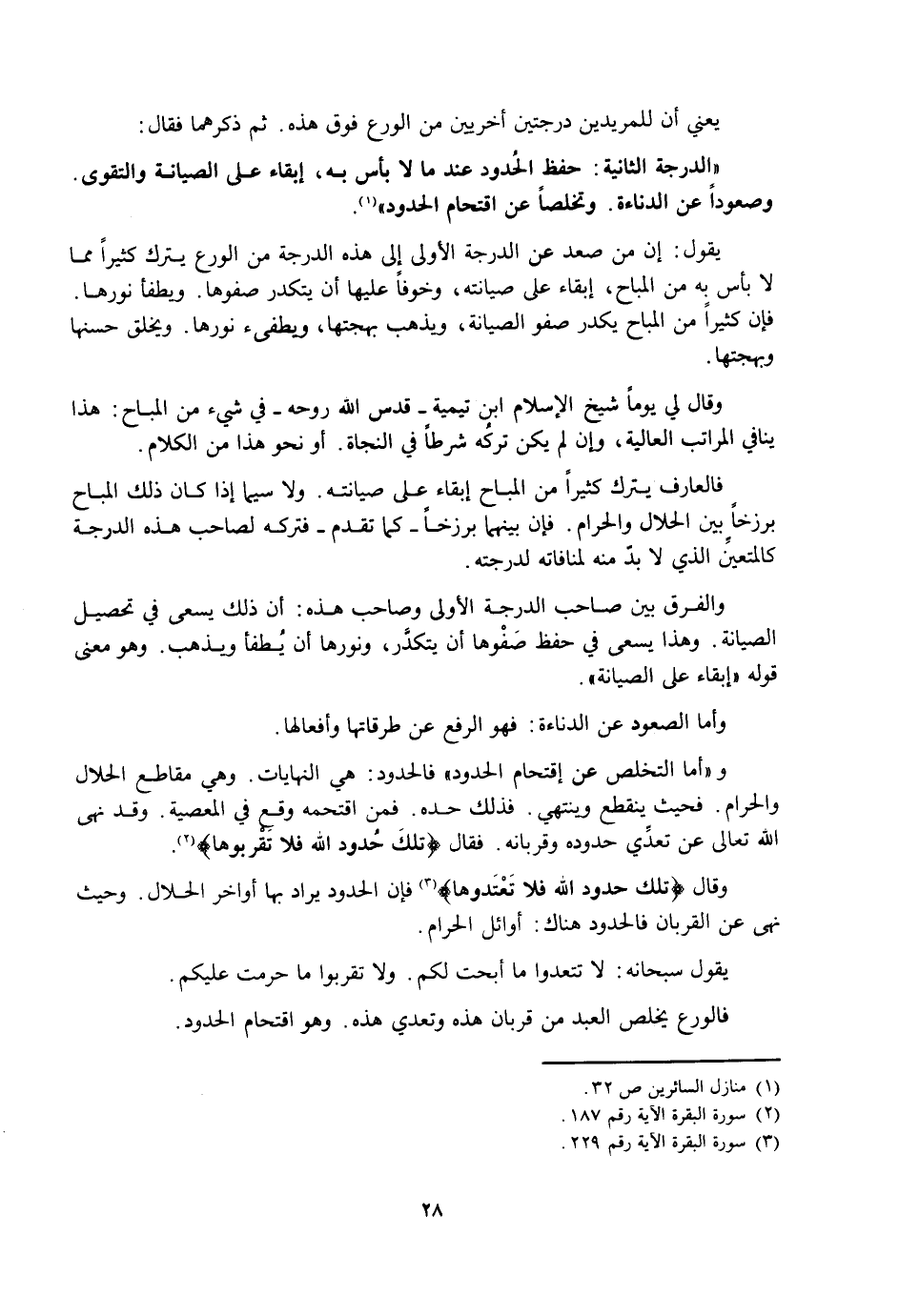 يَقُولُ: إِنَّ مَنْ صَعَدَ عَنِ الدَّرَجَةِ الْأُولَى إِلَى هَذِهِ الدَّرَجَةِ مِنَ الْوَرَعِ يَتْرُكُ كَثِيرًا مِمَّا لَا بَأْسَ بِهِ مِنَ الْمُبَاحِ، إِبْقَاءً عَلَى صِيَانَتِهِ، وَخَوْفًا عَلَيْهَا أَنْ يَتَكَدَّرَ صَفْوُهَا. وَيُطْفَأَ نُورُهَا. فَإِنَّ كَثِيرًا مِنَ الْمُبَاحِ يُكَدِّرُ صَفْوَ الصِّيَانَةِ، وَيُذْهِبُ بَهْجَتَهَا، وَيُطْفِئُ نُورَهَا، وَيُخْلِقُ حُسْنَهَا وَبَهْجَتَهَا.
