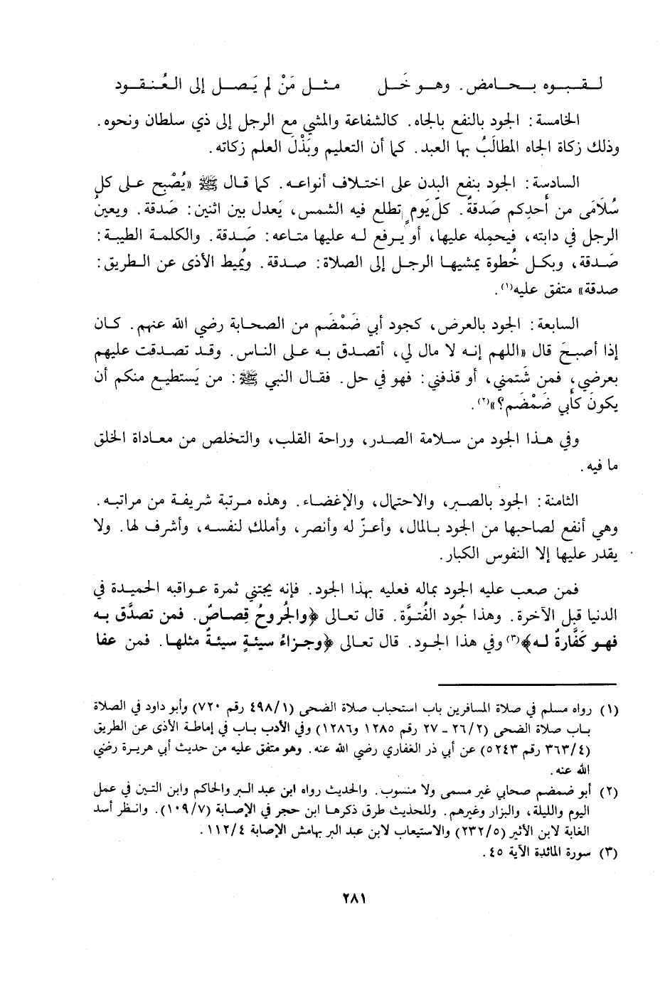 وَفِي هَذَا الْجُودِ مِنْ سَلَامَةِ الصَّدْرِ، وَرَاحَةِ الْقَلْبِ، وَالتَّخَلُّصِ مِنْ مُعَادَاةِ الْخَلْقِ مَا فِيهِ.