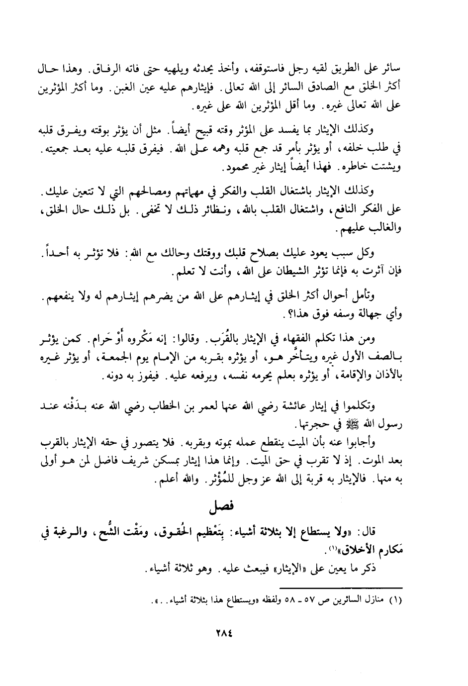 وَكُلُّ سَبَبٍ يَعُودُ عَلَيْكَ بِصَلَاحِ قَلْبِكَ وَوَقْتِكَ وَحَالِكَ مَعَ اللَّهِ: فَلَا تُؤْثِرْ بِهِ أَحَدًا. فَإِنْ آثَرْتَ بِهِ فَإِنَّمَا تُؤْثِرُ الشَّيْطَانَ عَلَى اللَّهِ، وَأَنْتَ لَا تَعْلَمُ.
