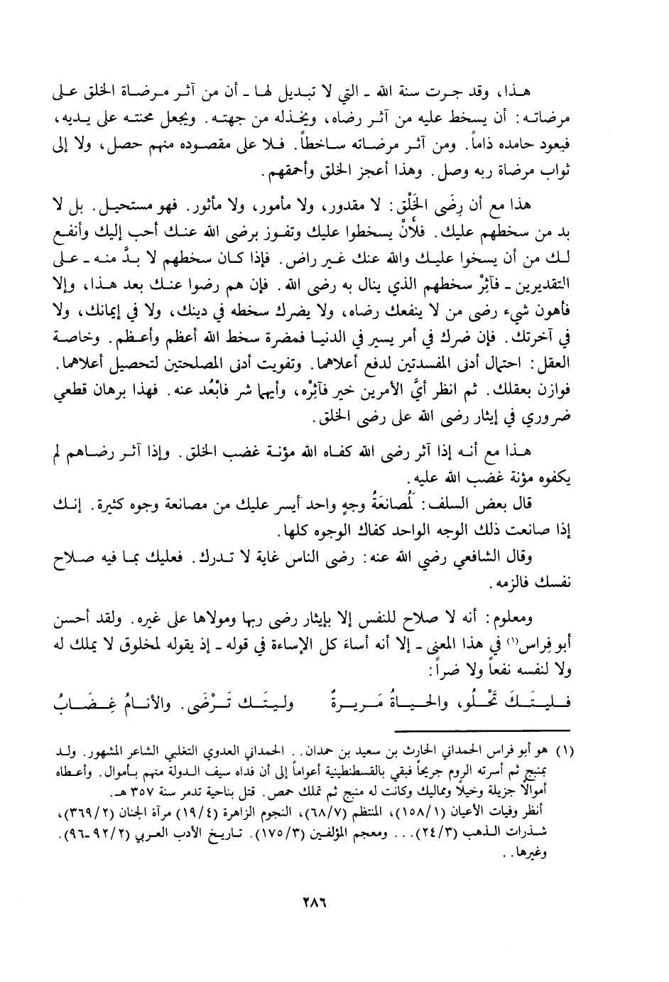 وَمَعْلُومٌ: أَنَّهُ لَا صَلَاحَ لِلنَّفْسِ إِلَّا بِإِيثَارِ رِضَا رَبِّهَا وَمَوْلَاهَا عَلَى غَيْرِهِ. وَلَقَدْ أَحْسَنَ أَبُو فِرَاسٍ فِي هَذَا الْمَعْنَى - إِلَّا أَنَّهُ أَسَاءَ كُلَّ الْإِسَاءَةِ فِي قَوْلِهِ، إِذْ يَقُولُهُ لِمَخْلُوقٍ لَا يَمْلِكُ لَهُ وَلَا لِنَفْسِهِ نَفْعًا وَلَا ضَرًّا: