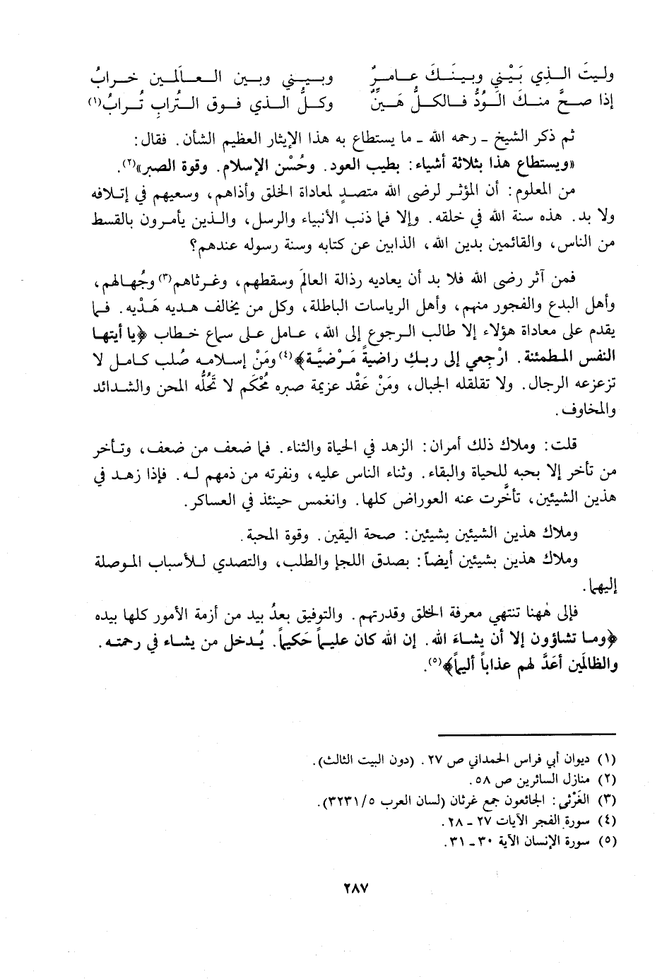 فَمَنْ آثَرَ رِضَا اللَّهِ فَلَا بُدَّ أَنْ يُعَادِيَهُ رَذَالَةُ الْعَالَمِ وَسَقْطُهُمْ، وَغَرْثَاهُمْ وَجُهَّالُهُمْ، وَأَهْلُ الْبِدَعِ وَالْفُجُورِ مِنْهُمْ، وَأَهْلُ الرِّيَاسَاتِ الْبَاطِلَةِ، وَكُلُّ مَنْ يُخَالِفُ هَدْيُهُ هَدْيَهُ. فَمَا يَقْدَمُ عَلَى مُعَادَاةِ هَؤُلَاءِ إِلَّا طَالِبُ الرُّجُوعِ إِلَى اللَّهِ، عَامِلٌ عَلَى سَمَاعِ خِطَابِ {يَاأَيَّتُهَا النَّفْسُ الْمُطْمَئِنَّةُ - ارْجِعِي إِلَى رَبِّكِ رَاضِيَةً مَرْضِيَّةً} [الفجر: 27 - 28] وَمِنْ إِسْلَامِهِ صُلْبٌ كَامِلٌ لَا تُزَعْزِعُهُ الرِّجَالُ. وَلَا تُقَلْقِلُهُ الْجِبَالُ، وَمِنْ عَقْدَ عَزِيمَةِ صَبْرِهِ مُحْكَمٌ لَا تَحُلُّهُ الْمِحَنُ وَالشَّدَائِدُ وَالْمَخَاوِفُ.