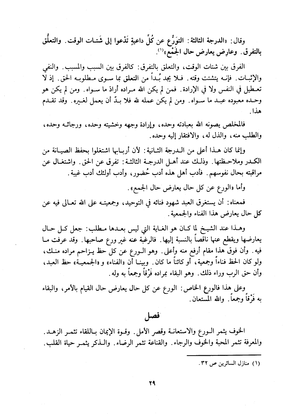 وَقَالَ: الدَّرَجَةُ الثَّالِثَةُ: التَّوَرُّعُ عَنْ كُلِّ دَاعِيَةٍ تَدْعُو إِلَى شَتَاتِ الْوَقْتِ. وَالتَّعَلُّقِ بِالتَّفَرُّقِ. وَعَارِضٍ يُعَارِضُ حَالَ الْجَمْعِ.