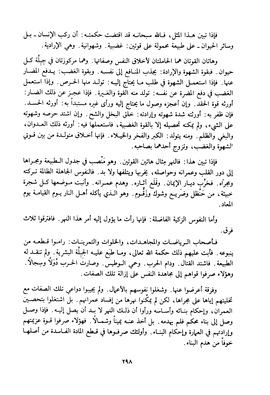 وَفِرْقَةٌ أَعْرَضُوا عَنْهَا. وَشَغَلُوا نُفُوسَهُمْ بِالْأَعْمَالِ. وَلَمْ يُجِيبُوا دَوَاعِيَ تِلْكَ الصِّفَاتِ مَعَ تَخْلِيَتِهِمْ إِيَّاهَا عَلَى مَجْرَاهَا، لَكِنْ لَمْ يُمَكِّنُوا نَهْرَهَا مِنْ إِفْسَادِ عُمْرَانِهِمْ. بَلِ اشْتَغَلُوا بِتَحْصِينِ الْعُمْرَانِ، وَإِحْكَامِ بِنَائِهِ وَأَسَاسِهِ وَرَأَوْا أَنَّ ذَلِكَ النَّهْرَ لَا بُدَّ أَنْ يَصِلَ إِلَيْهِ. فَإِذَا وَصَلَ وَصَلَ إِلَى بِنَاءٍ مُحْكَمٍ فَلَمْ يَهْدِمْهُ. بَلْ أَخَذَ عَنْهُ يَمِينًا وَشِمَالًا. فَهَؤُلَاءِ صَرَفُوا قُوَّةَ عَزِيمَتِهِمْ وَإِرَادَتِهِمْ فِي الْعِمَارَةِ، وَإِحْكَامِ الْبِنَاءِ. وَأُولَئِكَ صَرَفُوهَا فِي قَطْعِ الْمَادَّةِ الْفَاسِدَةِ مِنْ أَصْلِهَا، خَوْفًا مِنْ هَدْمِ الْبِنَاءِ.