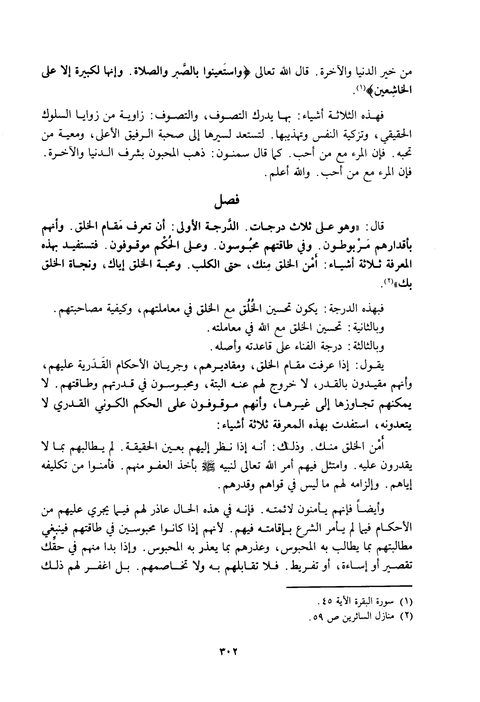 فَهَذِهِ الثَّلَاثَةُ أَشْيَاءَ: بِهَا يُدْرَكُ التَّصَوُّفُ، وَالتَّصَوُّفُ: زَاوِيَةٌ مِنْ زَوَايَا السُّلُوكِ الْحَقِيقِيِّ، وَتَزْكِيَةِ النَّفْسِ وَتَهْذِيبِهَا. لِتَسْتَعِدَّ لِسَيْرِهَا إِلَى صُحْبَةِ الرَّفِيقِ الْأَعْلَى، وَمَعِيَّةِ مَنْ تُحِبُّهُ. فَإِنَّ الْمَرْءَ مَعَ مَنْ أَحَبَّ. كَمَا قَالَ سُمْنُونُ: ذَهَبَ الْمُحِبُّونَ بِشَرَفِ الدُّنْيَا وَالْآخِرَةِ. فَإِنَّ الْمَرْءَ مَعَ مَنْ أَحَبَّ. وَاللَّهُ أَعْلَمُ.