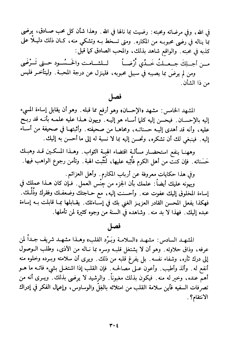 الْمَشْهَدُ الْخَامِسُ: مَشْهَدُ الْإِحْسَانِ وَهُوَ أَرْفَعُ مِمَّا قَبْلَهُ. وَهُوَ أَنْ يُقَابِلَ إِسَاءَةَ الْمُسِيءِ إِلَيْهِ بِالْإِحْسَانِ. فَيُحْسِنَ إِلَيْهِ كُلَّمَا أَسَاءَ هُوَ إِلَيْهِ. وَيُهَوِّنُ هَذَا عَلَيْهِ عِلْمُهُ بِأَنَّهُ قَدْ رَبِحَ عَلَيْهِ. وَأَنَّهُ قَدْ أَهْدَى إِلَيْهِ حَسَنَاتِهِ، وَمَحَاهَا مِنْ صَحِيفَتِهِ. وَأَثْبَتَهَا فِي صَحِيفَةِ مَنْ أَسَاءَ إِلَيْهِ. فَيَنْبَغِي لَكَ أَنْ تَشْكُرَهُ، وَتُحْسِنَ إِلَيْهِ بِمَا لَا نِسْبَةَ لَهُ إِلَى مَا أَحْسَنَ بِهِ إِلَيْكَ.