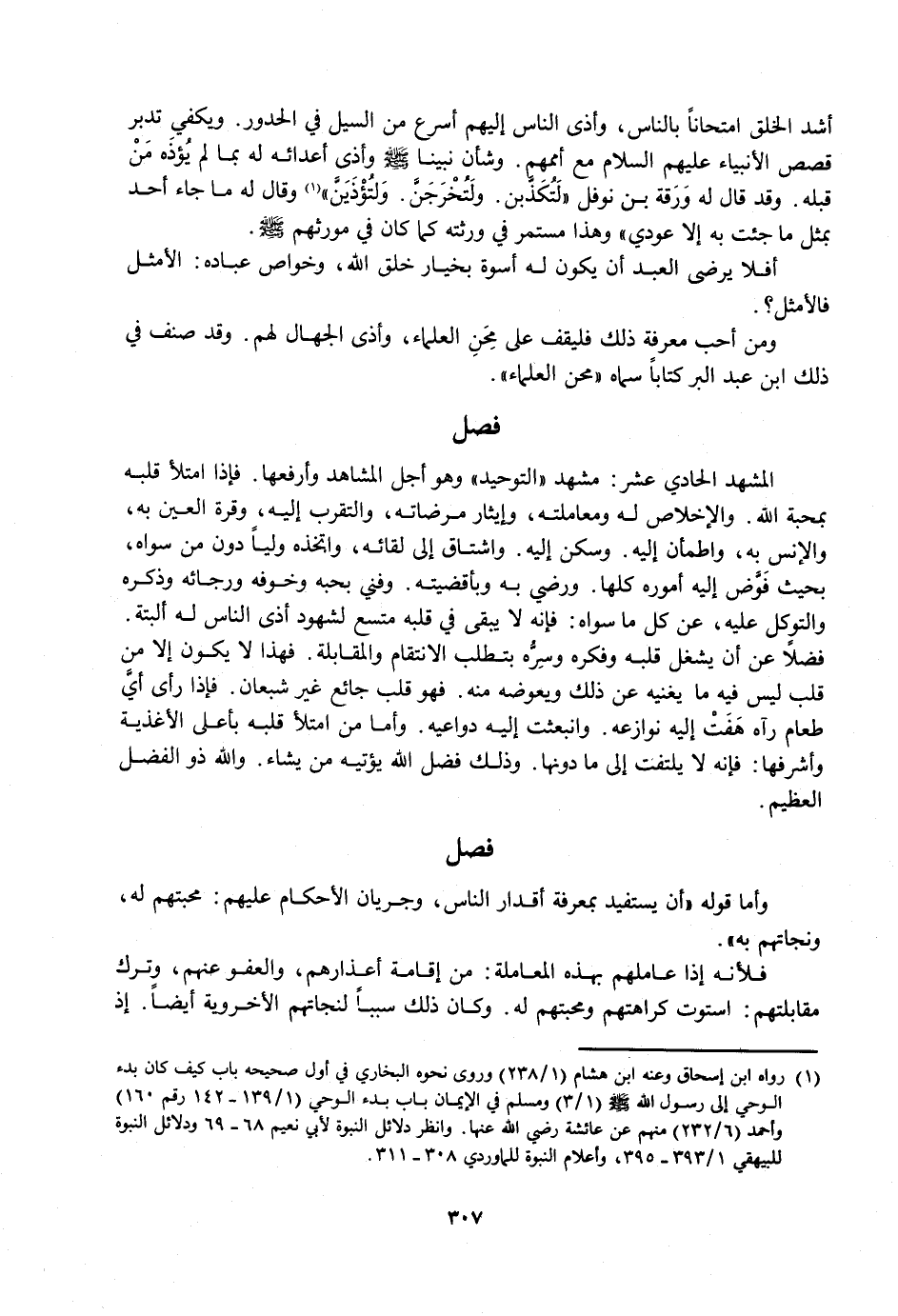 الْمَشْهَدُ الْحَادِيَ عَشَرَ: مَشْهَدُ التَّوْحِيدِ وَهُوَ أَجَلُّ الْمَشَاهِدِ وَأَرْفَعُهَا. فَإِذَا امْتَلَأَ قَلْبُهُ بِمَحَبَّةِ اللَّهِ، وَالْإِخْلَاصِ لَهُ وَمُعَامَلَتِهِ، وَإِيثَارِ مَرْضَاتِهِ، وَالتَّقَرُّبِ إِلَيْهِ، وَقُرَّةِ الْعَيْنِ بِهِ، وَالْأُنْسِ بِهِ، وَاطْمَأَنَّ إِلَيْهِ. وَسَكَنَ إِلَيْهِ. وَاشْتَاقَ إِلَى لِقَائِهِ، وَاتَّخَذَهُ وَلِيًّا دُونَ مَنْ سِوَاهُ، بِحَيْثُ فَوَّضَ إِلَيْهِ أُمُورَهُ كُلَّهَا. وَرَضِيَ بِهِ وَبِأَقْضِيَتِهِ. وَفَنِيَ بِحُبِّهِ وَخَوْفِهِ وَرَجَائِهِ وَذِكْرِهِ وَالتَّوَكُّلِ عَلَيْهِ، عَنْ كُلِّ مَا سِوَاهُ: فَإِنَّهُ لَا يَبْقَى فِي قَلْبِهِ مُتَّسَعٌ لِشُهُودِ أَذَى النَّاسِ لَهُ أَلْبَتَّةَ. فَضْلًا عَنْ أَنْ يَشْتَغِلَ قَلْبُهُ وَفِكْرُهُ وَسِرُّهُ بِتَطَلُّبِ الِانْتِقَامِ وَالْمُقَابَلَةِ. فَهَذَا لَا يَكُونُ إِلَّا مِنْ قَلْبٍ لَيْسَ فِيهِ مَا يُغْنِيهِ عَنْ ذَلِكَ وَيُعَوِّضُهُ مِنْهُ. فَهُوَ قَلْبٌ جَائِعٌ غَيْرُ شَبْعَانَ. فَإِذَا رَأَى أَيَّ طَعَامٍ رَآهُ هَفَّتْ إِلَيْهِ نَوَازِعُهُ. وَانْبَعَثَتْ إِلَيْهِ دَوَاعِيهِ. وَأَمَّا مَنِ امْتَلَأَ قَلْبُهُ بِأَعْلَى الْأَغْذِيَةِ وَأَشْرَفِهَا: فَإِنَّهُ لَا يَلْتَفِتُ إِلَى مَا دُونَهَا. وَذَلِكَ فَضْلُ اللَّهِ يُؤْتِيهِ مَنْ يَشَاءُ. وَاللَّهُ ذُو الْفَضْلِ الْعَظِيمِ.