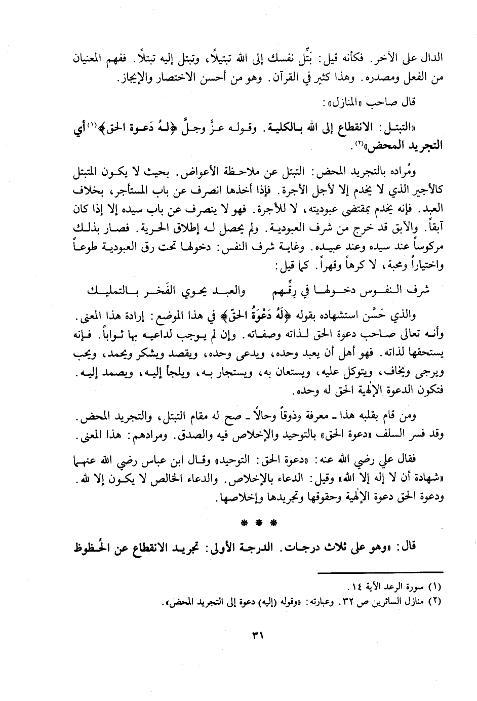 وَمَنْ قَامَ بِقَلْبِهِ هَذَا - مَعْرِفَةً وَذَوْقًا وَحَالًا - صَحَّ لَهُ مَقَامُ التَّبَتُّلِ، وَالتَّجْرِيدِ الْمَحْضِ. وَقَدْ فَسَّرَ السَّلَفُ دَعْوَةَ الْحَقِّ بِالتَّوْحِيدِ وَالْإِخْلَاصِ فِيهِ وَالصِّدْقِ. وَمُرَادُهُمْ هَذَا الْمَعْنَى.
