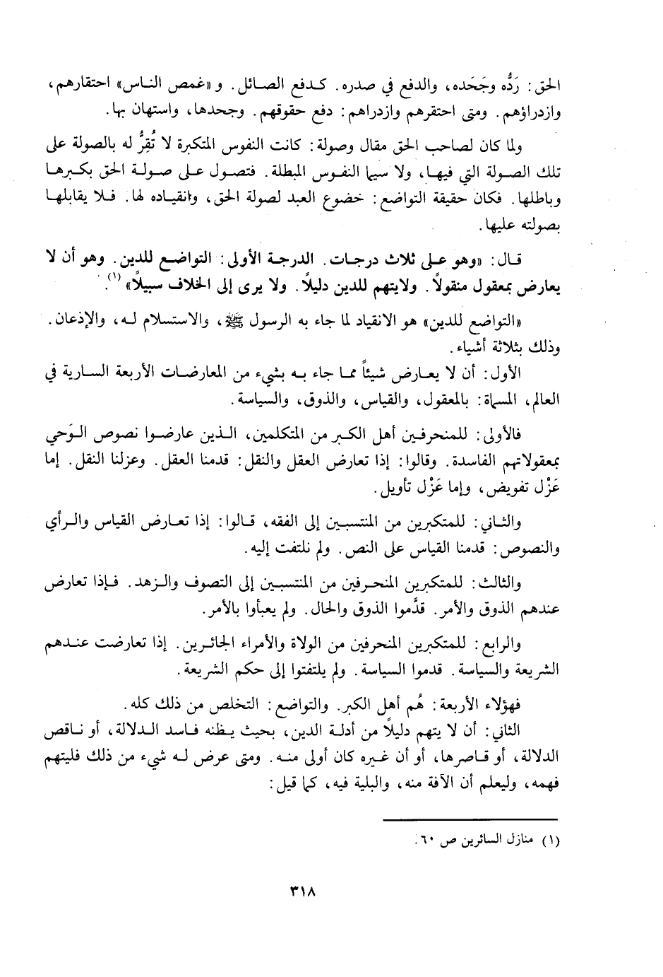 قَالَ: وَهُوَ عَلَى ثَلَاثِ دَرَجَاتٍ. الدَّرَجَةُ الْأُولَى: التَّوَاضُعُ لِلدِّينِ. وَهُوَ أَنْ لَا يُعَارِضَ بِمَعْقُولٍ مَنْقُولًا. وَلَا يَتَّهِمَ لِلدِّينِ دَلِيلًا. وَلَا يَرَى إِلَى الْخِلَافِ سَبِيلًا.