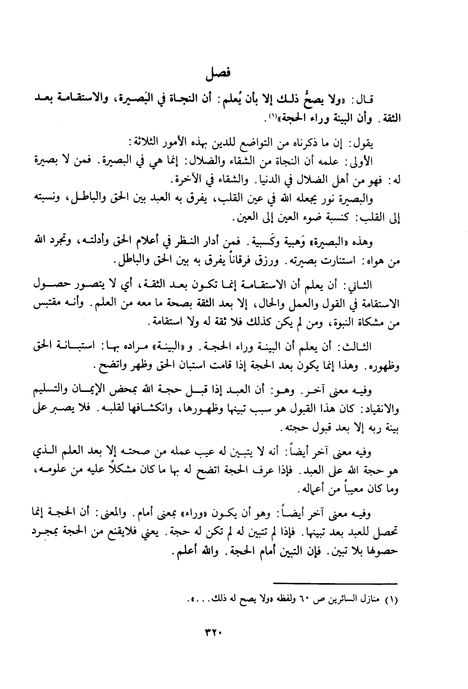 قَالَ: وَلَا يَصِحُّ ذَلِكَ إِلَّا بِأَنْ يُعْلَمَ: أَنَّ النَّجَاةَ فِي الْبَصِيرَةِ، وَالِاسْتِقَامَةَ بَعْدَ الثِّقَةِ. وَأَنَّ الْبَيِّنَةَ وَرَاءَ الْحُجَّةِ.